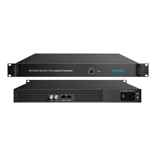FMUSER DTV-3611C-32/64 is a IP to RF modulator that can convert up to 32 (or 64) IP channels (or 4 HD/AV+28 IP channels; or 8 HD/AV+24 IP channels) to analog RF output. It also supports OSD (Logo and Caption) insertion for each channel; making it easy to operate; and supports CC/Subtitle/Teletext. Additionally; the product supports BISS de-scrambling; can modify program information; and choose multiple audio options. It has 2/4 GE ports for IP MPTS/SPTS input; with a maximum speed of 840Mbps for each GE input. The product supports HEVC/H.265; H.264/AVC; MPEG-2 TS decoding; and can output 32 (or 64) standard PAL or NTSC or SECAM TV programs via 32 (or 64) non-adjacent or adjacent carriers output within 400MHz. In addition; a redundant power supply is available as an option and it supports web-based network management. Also suitable Cable digital TV adjacent frequency front-end system; hotel IPTV network TV system and hotel satellite digital TV system.
