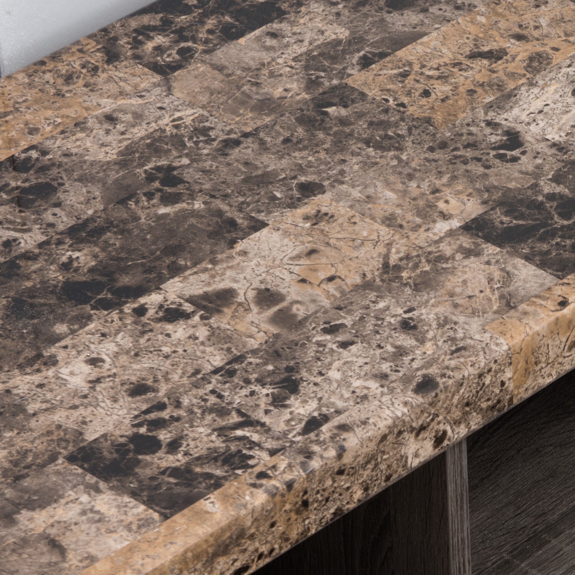 This faux marble top tv stand is a stunning addition to your home entertainment center. Featuring three open shelves, two bottom shelves, and one bottom drawer, this tv stand will provide you with the necessary storage space for your media accessories.