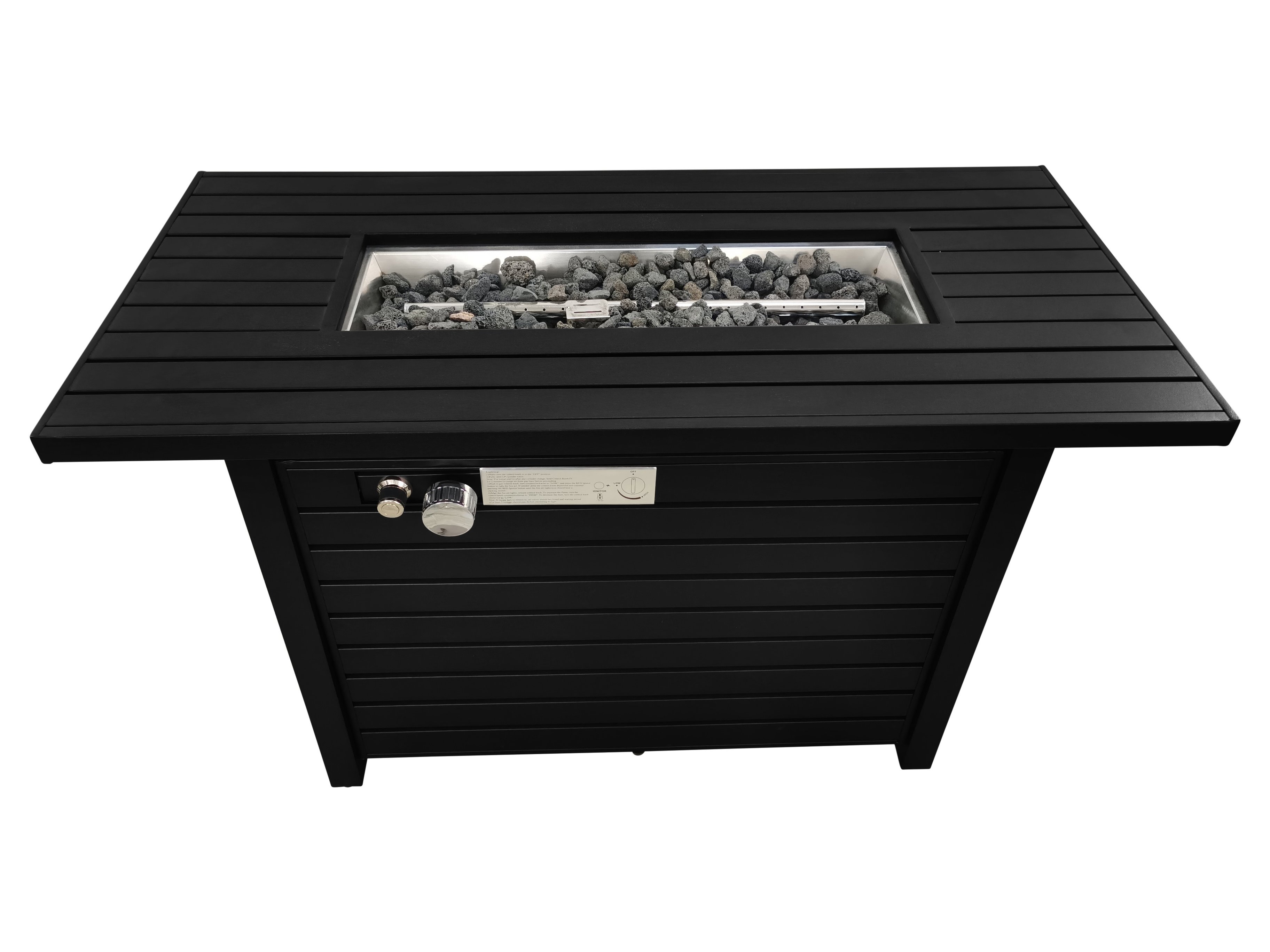 FeaturesProduct TypeFire pit tableExterior MaterialSteelExterior Material DetailsSteelBurning Area MaterialStainless SteelBurning Area Material DetailsStainless steelPowder Coated FinishYesFuel TypePropane; Natural gasGas Conversion FeatureYesGas Conversion Kit IncludedNoBurn Time of Fuel Accommodated8 hoursAdjustable FlameYesIgnition TypePush-buttonBTU Output50000 BTUCompatible Filler TypeLava RocksFiller IncludedYesFoldableNoPortableNoFire Pit Lid IncludedYesCover IncludedYesSpark Screen IncludedNoLog Grate IncludedNoLocationOutdoor Use OnlyHidden Fuel TankYesBatteries RequiredYesOverall ShapeRectangleSupplier Intended and Approved UseResidential Use; Non Residential UseProduct SizeMediumImportedYesBattery or Batteries IncludedYesCompatible Fuel Size20 lb.DurabilityRust Resistant; Heat ResistantProduct CareWipe clean with a dry clothColorBlackCover MaterialPolyesterSpecificationsSafety Listing(s)ETL ListedAssemblyAssembly RequiredYesSuggested Number of People for Assembly/Install1Installation RequiredYesAdditional Tools Required (Not Included)All Tools IncludedWarrantyCommercial WarrantyYesCommercial Warranty Length1 YearProduct WarrantyYesWarranty Length1 YearFull or Limited WarrantyLimitedWarranty DetailsManufacturer Warranty