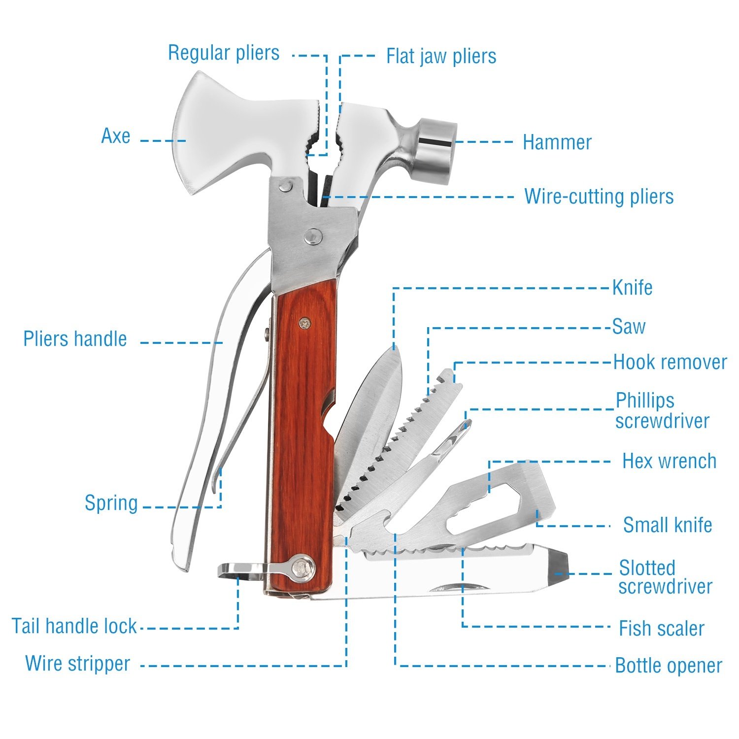 **14 IN 1 MULTIPURPOSE TOOL*:Can be used as axe; (emergency) hammer; pliers(flat jaw plier; regular pliers and wire-cutting pliers); knife; blade; saw; assorted hex wrenches; Phillips screwdriver; slotted screwdriver; bottle opener; nail file; fish scaler and more to meet different needs.