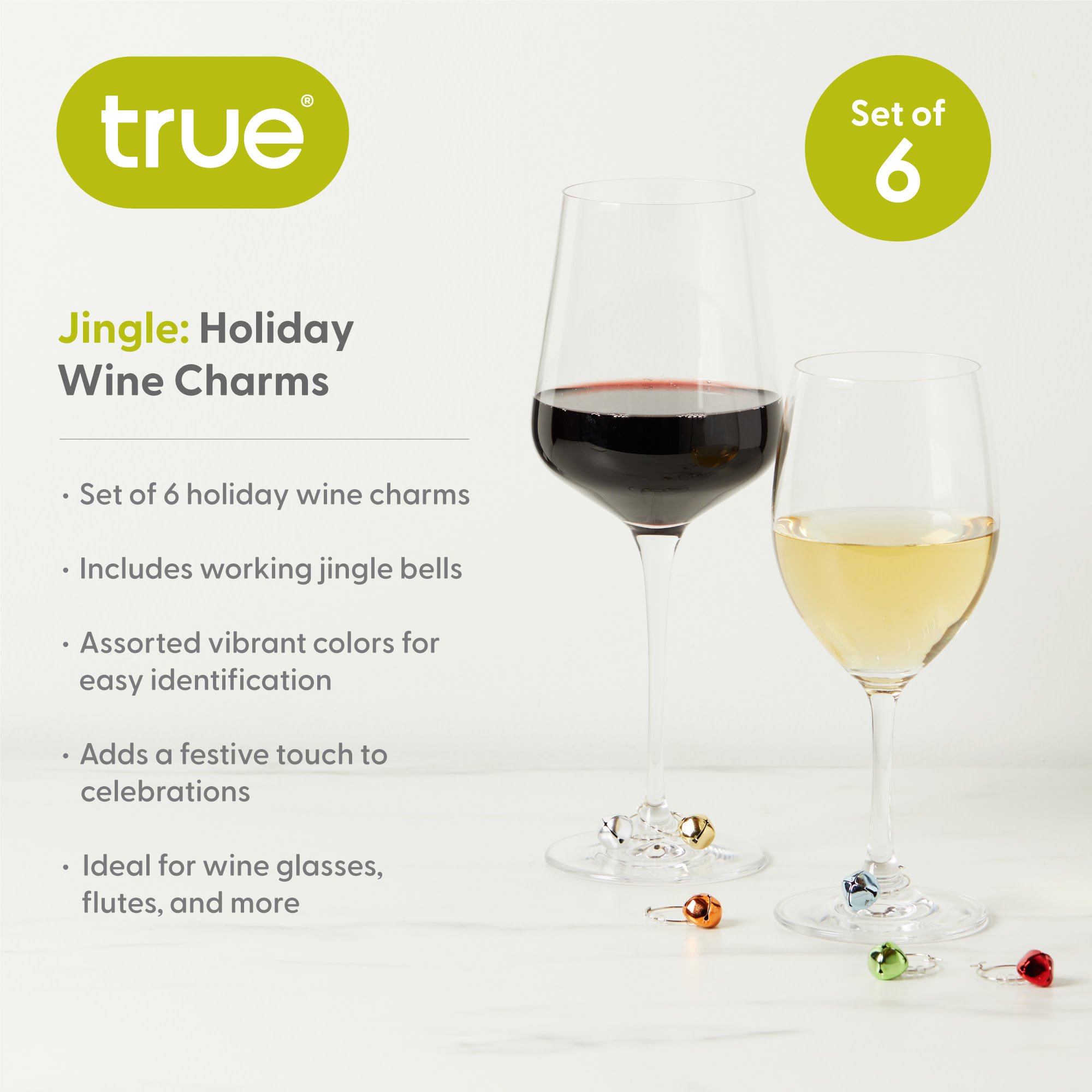 Ring in the holiday season with our cheery Jingle Holiday Wine Charms. These six colorful, working bells jingle merrily from the stems of any wine glasses or champagne flutes, and are guaranteed to get anyone and everyone into the holiday spirit.