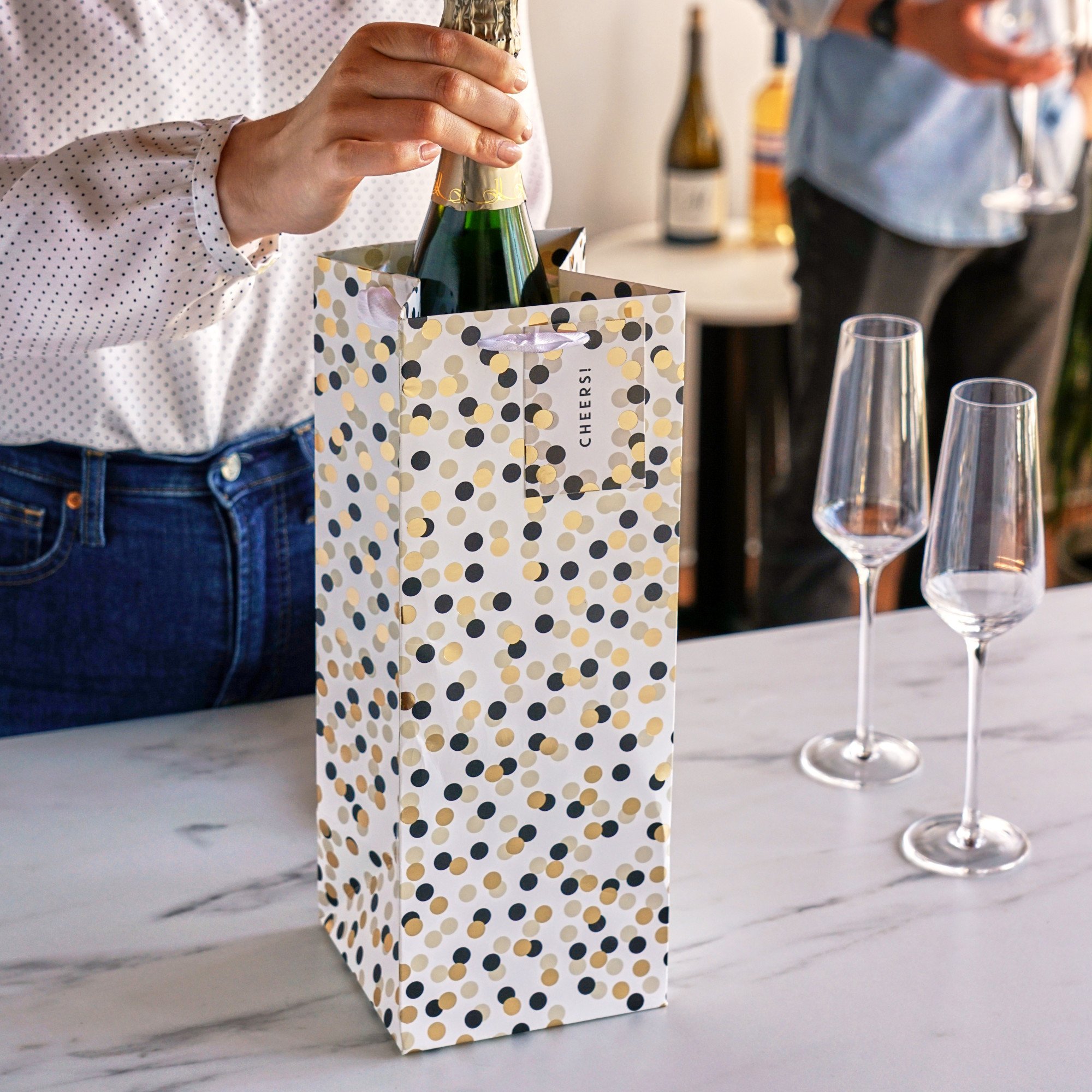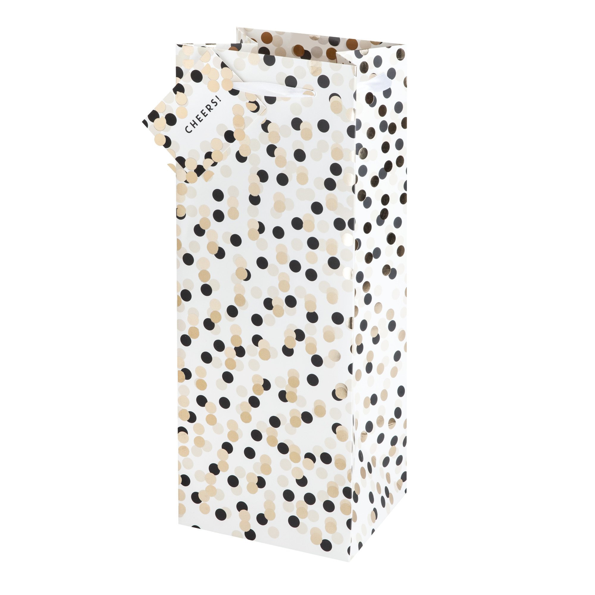 Black, cream and foiled gold polka dots dance on the surface of this bubbly, celebration-ready bag. Accented with white ribbon handles and a “Cheers!” gift tag, it dresses one bottle of bubbles or booze up perfectly for any occasion.