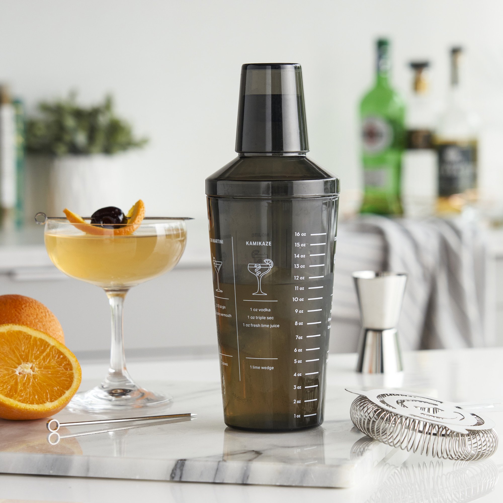 • MIX MEASURE AND SHAKE WITH EASE - The included jigger cap and strainer lid plus ounce markings means you’re prepared to measure ingredients and pour up beautiful cocktails from start to finish.