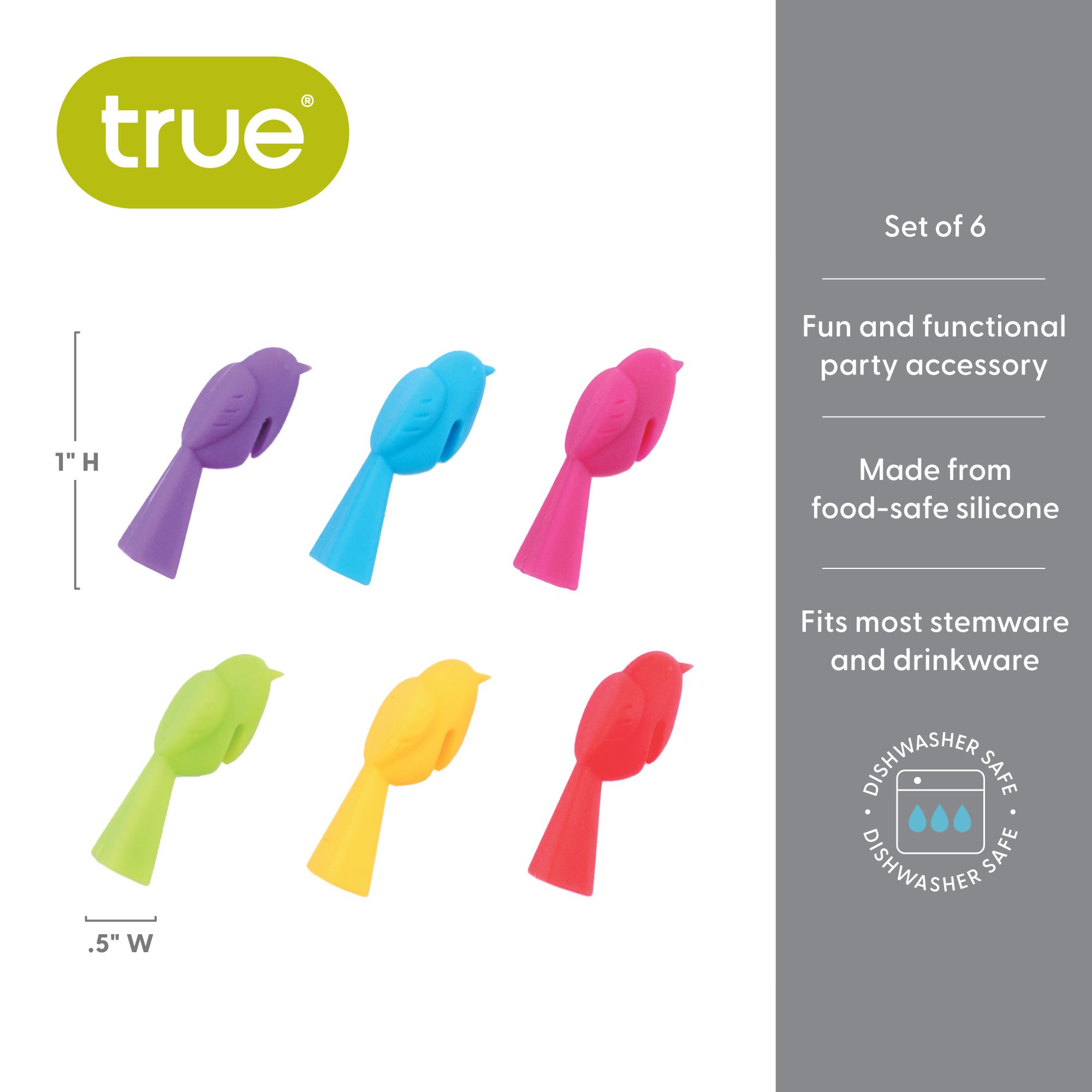 Introducing the Chickadee Glass Markers from True, a unique and playful addition to your party accessories. This set of 6 multicolor silicone wine charms has been designed with utility and style in mind. These wine glass markers silicone enhance your drinkware by adding a touch of color and fun, making them the perfect cup identifiers for your parties or family gatherings. Each charm is shaped like a cute chickadee, adding an element of charm to your drinking experience. Crafted from food-safe silicone, these glass identifiers for drinks are not only practical but also safe and non-toxic. They are designed to comfortably fit any wine glass rim, ensuring that your guests can easily distinguish their drinks. The Chickadee Glass Markers are not just cup markers, they also serve as beautiful glass markers & charms, adding a festive touch to your party. They are perfect wine markers for stemless glasses as well, making them a versatile accessory in your kitchen.