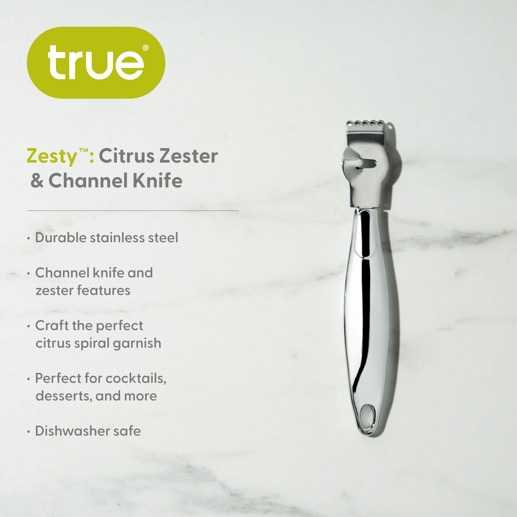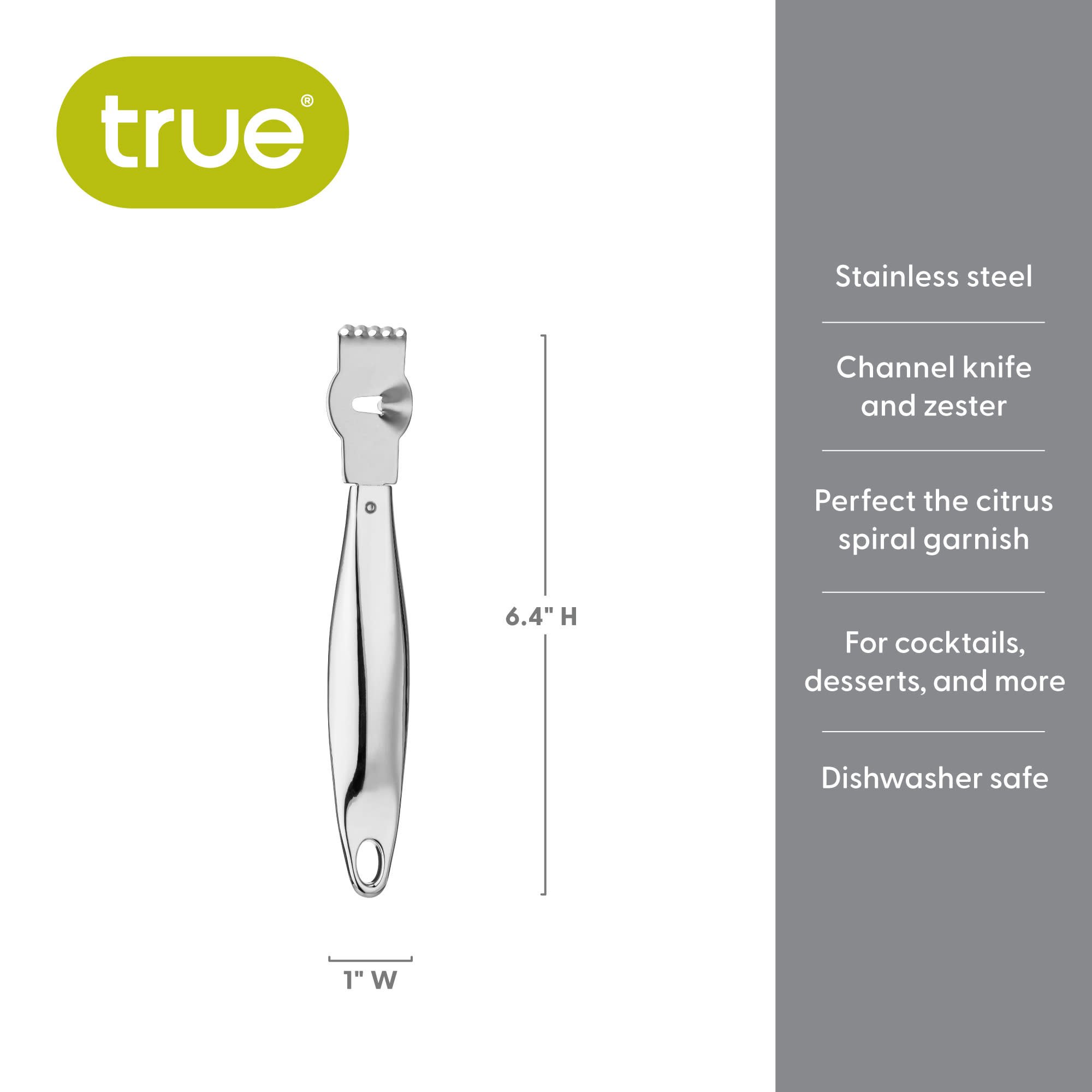 Introducing the Zesty Stainless Steel Citrus Zester Tool & Channel Knife Bar Tool from True, a leading brand in kitchen gadgets and bar accessories. This sturdy and practical tool is a must-have addition to your home kitchen or bar. A perfect blend of form and functionality, this versatile tool offers sharp blades for zesting and a channel knife for cocktails and garnishing. Our zester tool is a quintessential piece among bar tools bartender accessories. It is designed to work perfectly with orange, lime, and lemon peels, zesting them effortlessly to add that extra kick to your cocktails. The citrus peeler tool enables you to create appealing garnishes to elevate the aesthetics of your drinks. It's not just a lemon zester tool, but also an efficient orange peeler for cocktails, and a lime zester. You can use this lemon peeler for cocktails to garnish with accents like nutmeg and chocolate, making it one of the most versatile bar supplies you can own. This small zester is also an excellent coconut scraper, adding even more value to your collection of kitchen bar or home bar accessories.