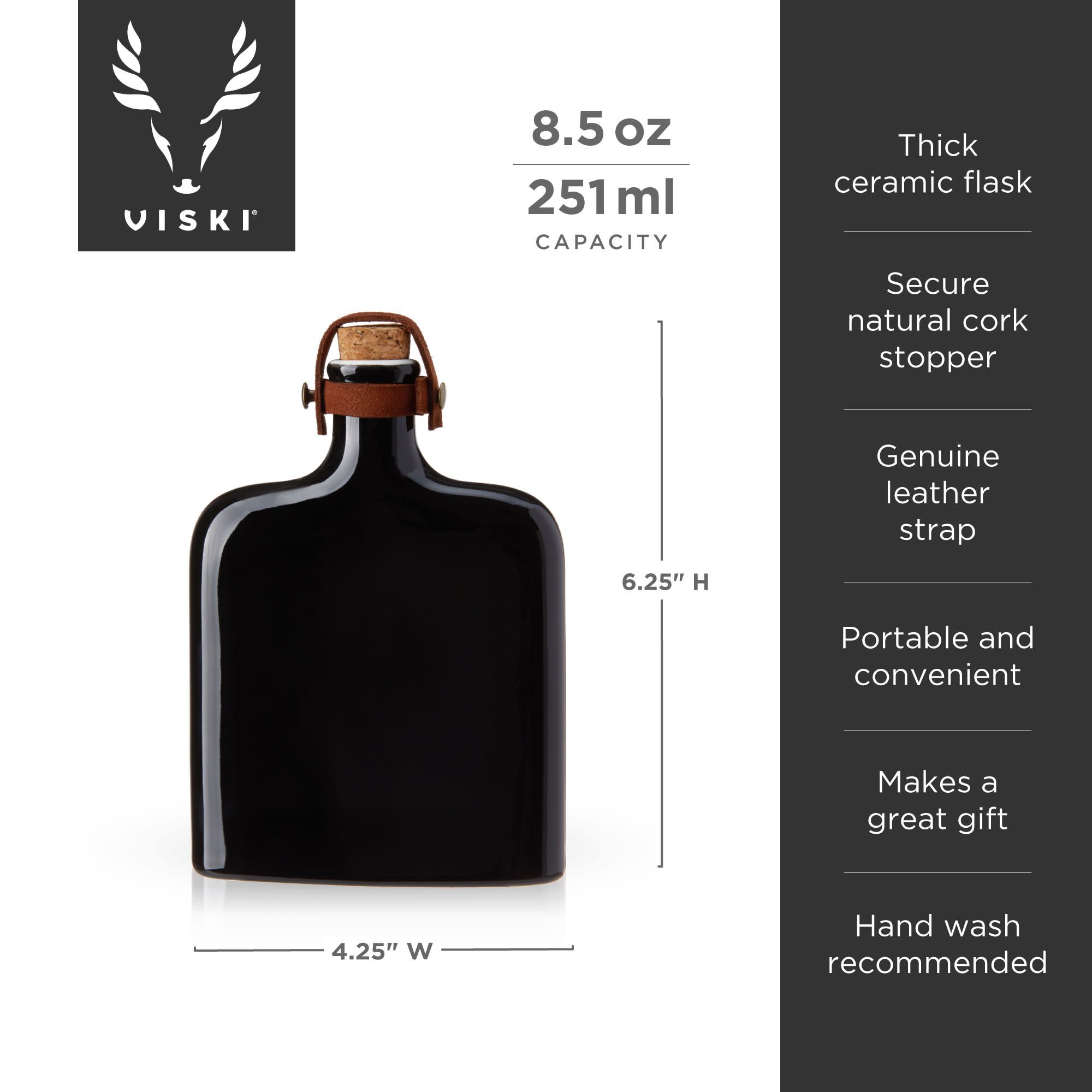 • 8.5 0Z LIQUOR FLASK WITH CORK - This black hip flask holds 8.5 oz. of your favorite beverage. This black ceramic flask has a real cork secured with leather for a vintage look. The ceramic flask is a beautiful version of classic drinking flasks.