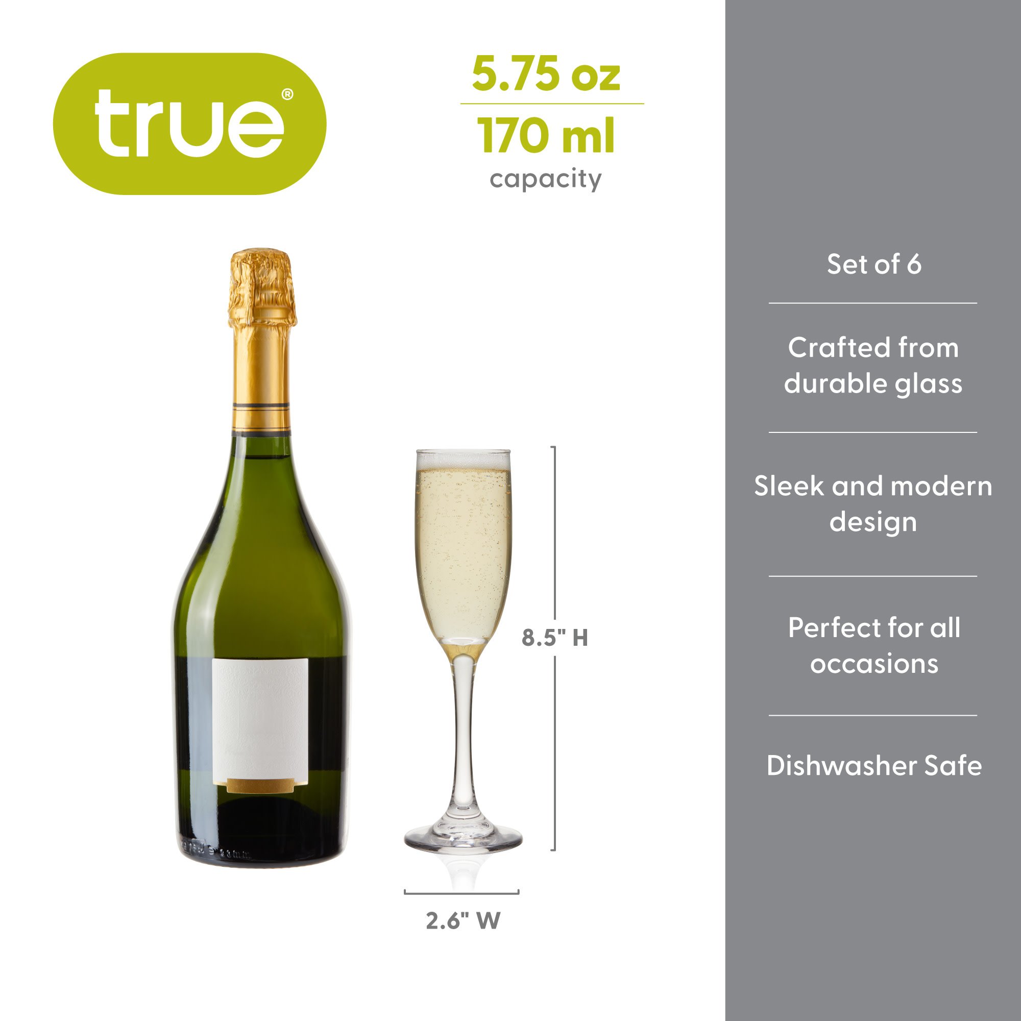 • WINE GLASS SET OF 6 CHAMPAGNE FLUTES - Crafted from durable glass, these stemmed champagne glasses are perfect for dinner parties and events. They’re perfect for champagne wine, champagne cocktails, or as mimosa glasses and Prosecco glasses.