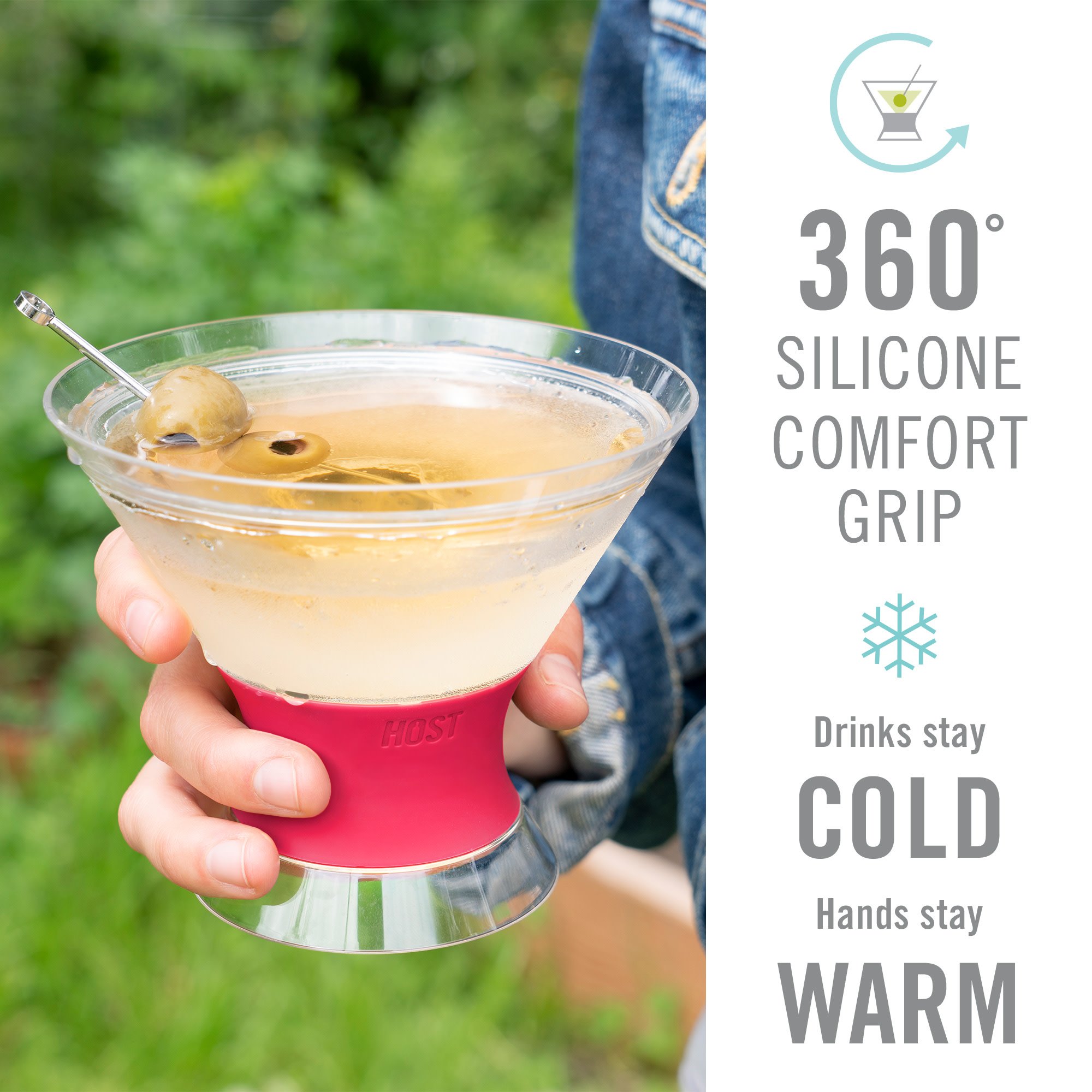 • COMFORT-GRIP SILICONE BAND FOR EASY SIPPING - The BPA-free plastic construction creates a sturdy martini glass that works everywhere. A bright pink insulated silicone band on the base makes for comfortable handling, perfect for the outdoors! Hand wash only.