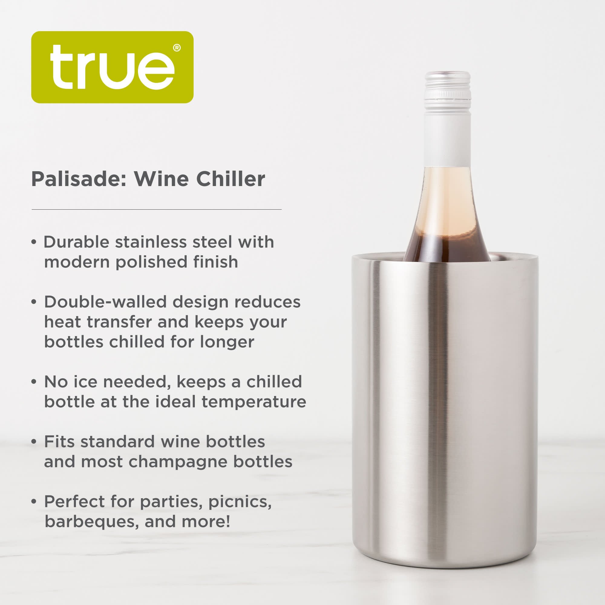 Serve your bottles at the perfect temperature with our Palisade Wine Chiller, no ice required. Sleek and double-walled, this piece can hold standard wine and most champagne bottles and keeps a chilled bottle at the ideal temperature. Measures 4.2 x 4.2 x 7.2 inches.