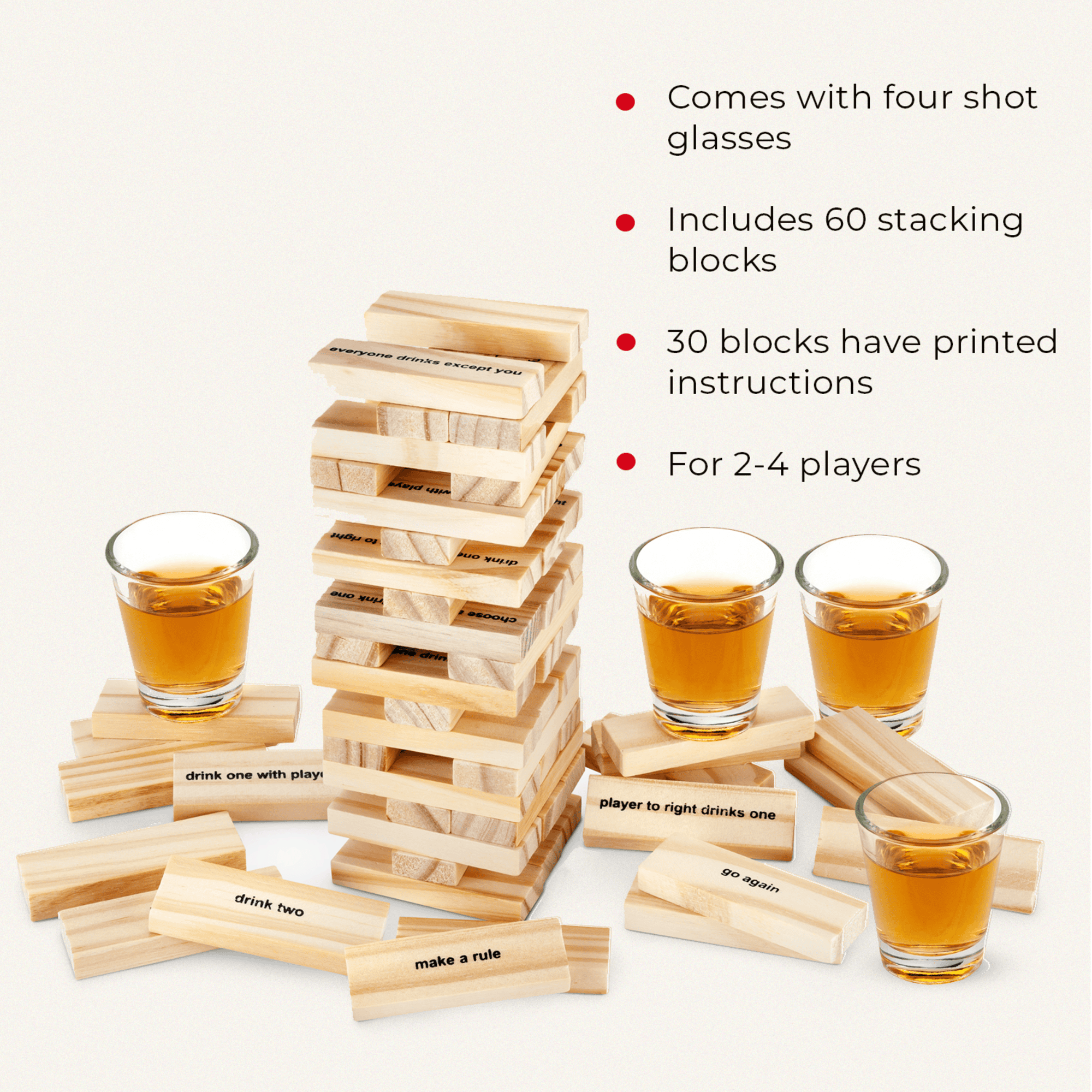 Build the party and break it down again with this adult twist on the classic block stacking group game. Each block is stamped with written instructions so you never have to question the rules after a few rounds. With four shot glasses included, our Stack™ Drinking Game will have everything you need to get the party started.