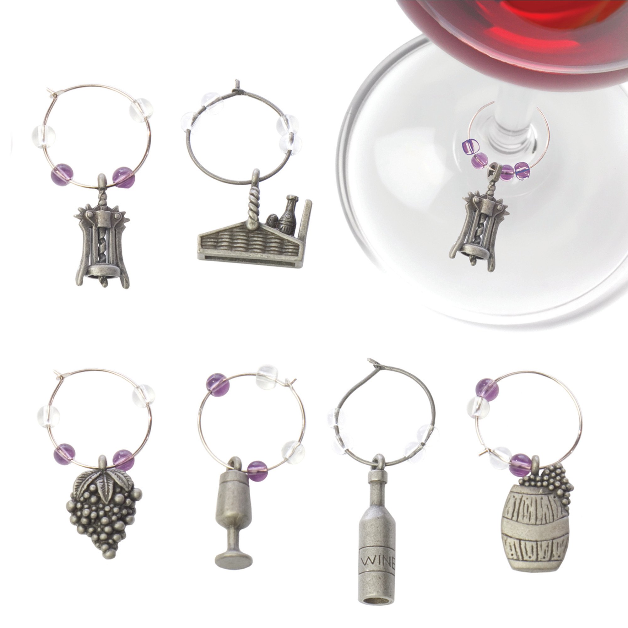 • ASSORTED DESIGN WINE GLASS MARKERS - Our set of 6 stainless steel and pewter wine markers for glasses come in assorted designs, from a corkscrew to a barrel to a bunch of juicy grapes, providing a fun way to identify your drink.