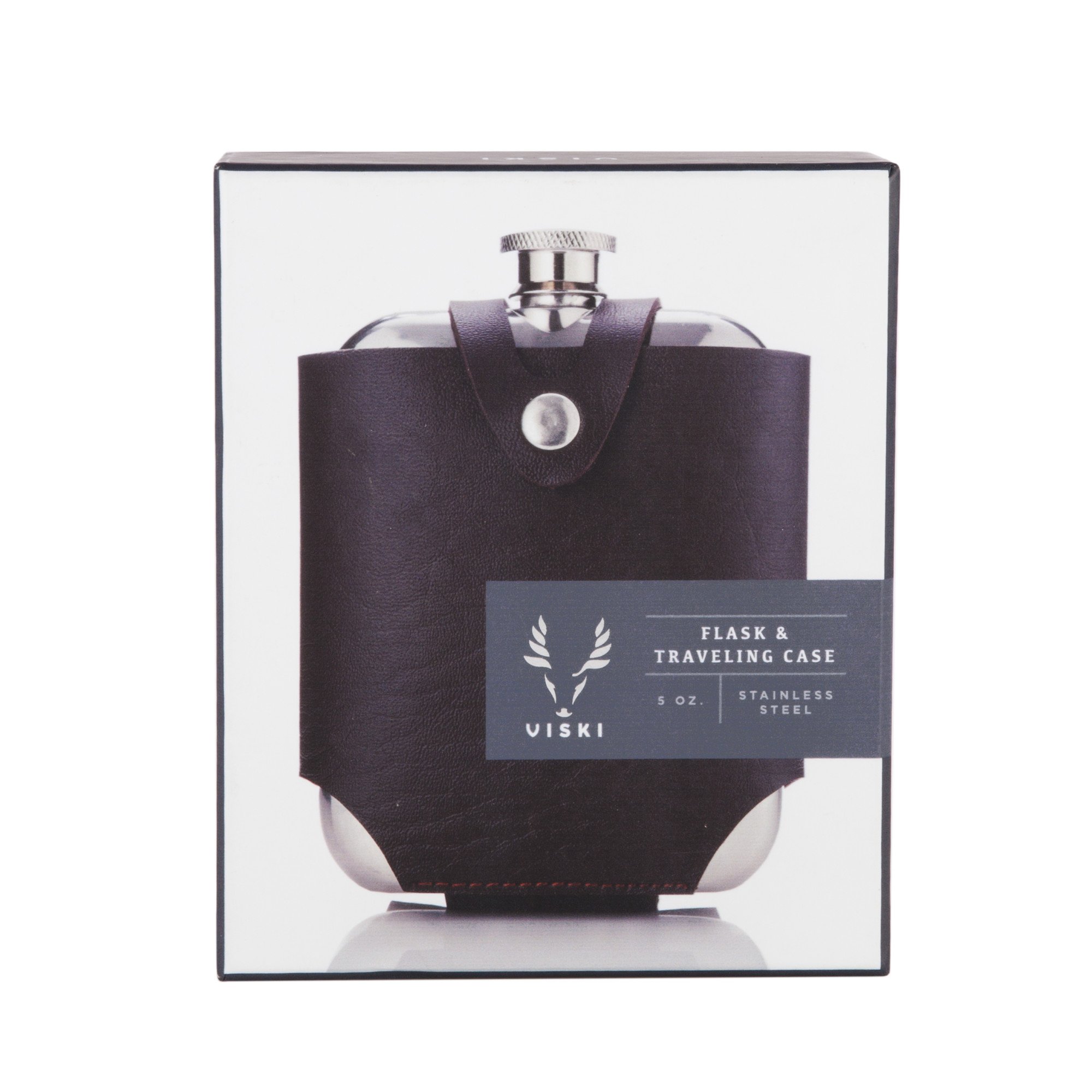 Discover the Viski Stainless Steel Flask and Traveling Case, the perfect novelty hip flask for those who enjoy a sip of their favorite liquor on the go. This metal flask is a stylish and practical accessory designed for the modern gentleman. Whether you're heading to a social event or simply enjoying a quiet evening outdoors, this whiskey flask is sure to elevate your drinking experience. Snap your silver five-ounce vessel into a rich chocolate-brown carrying case and set off on the next adventure. The exterior features a faux leather construction that adds a touch of elegance and durability. This leather wrap flask is designed to withstand the rigors of regular use, making it an ideal flask for liquor enthusiasts. Disclaimer : Flasks aren't meant for storing alcohol long-term. Leaving liquor in a flask for too long might lead to undesirable flavors. To keep things fresh, finish or replace the contents within a few days. Cheers and happy sipping!