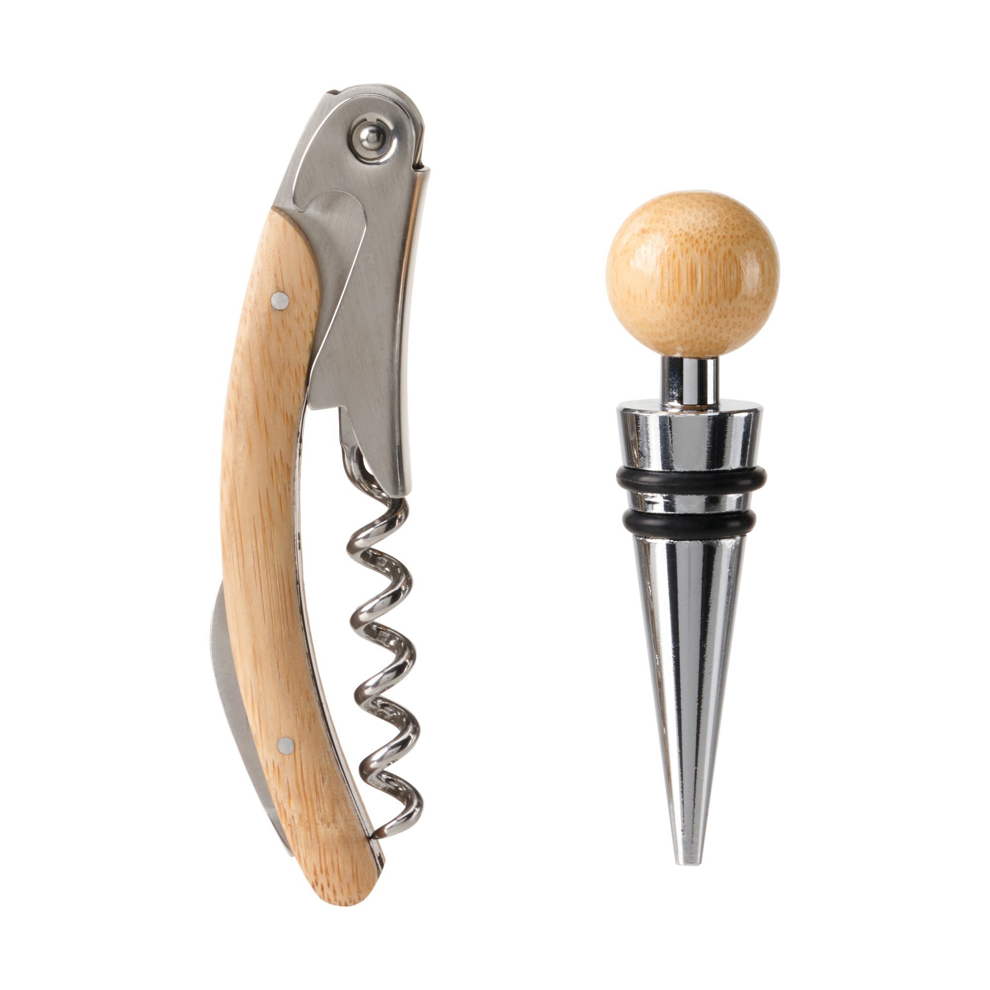 • HIGH-QUALITY WINE ACCESSORY SET - Our Keepsake Bamboo Accessory Set features a naturally curved corkscrew opener and a smooth spherical bottle stopper, perfect for effortlessly uncorking your favorite wines and resealing your bottled beverages.