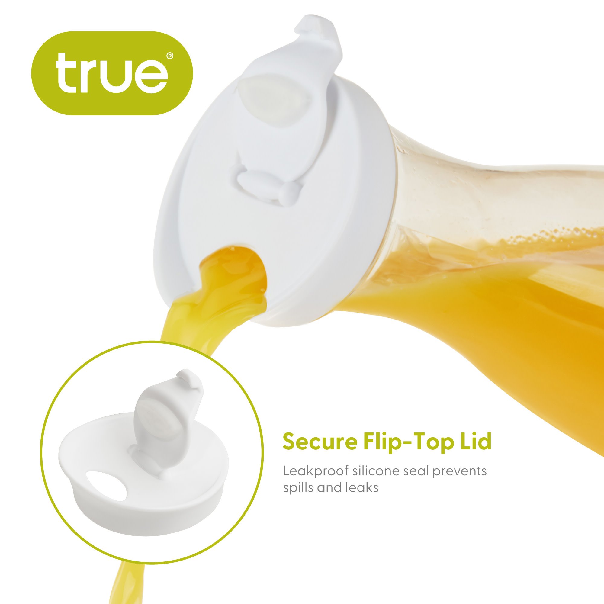Keep cold drinks at the ready with this carafe. The flip-top lid is perfect for pouring and preventing spills, while the carafe conveniently fits in most standard fridge doors. Use this carafe for iced coffee, spa water, iced tea, or your favorite cold drink. These plastic juice bottles with lids make great drink dispensers for parties or mimosa bar supplies and are perfect for fresh orange juice or grapefruit juice. Use this plastic pitcher with lid as a milk container for refrigerators or whatever else you need like batch cocktails for a party. Care: Hand wash recommended. 54 oz capacity. BPA-free PET