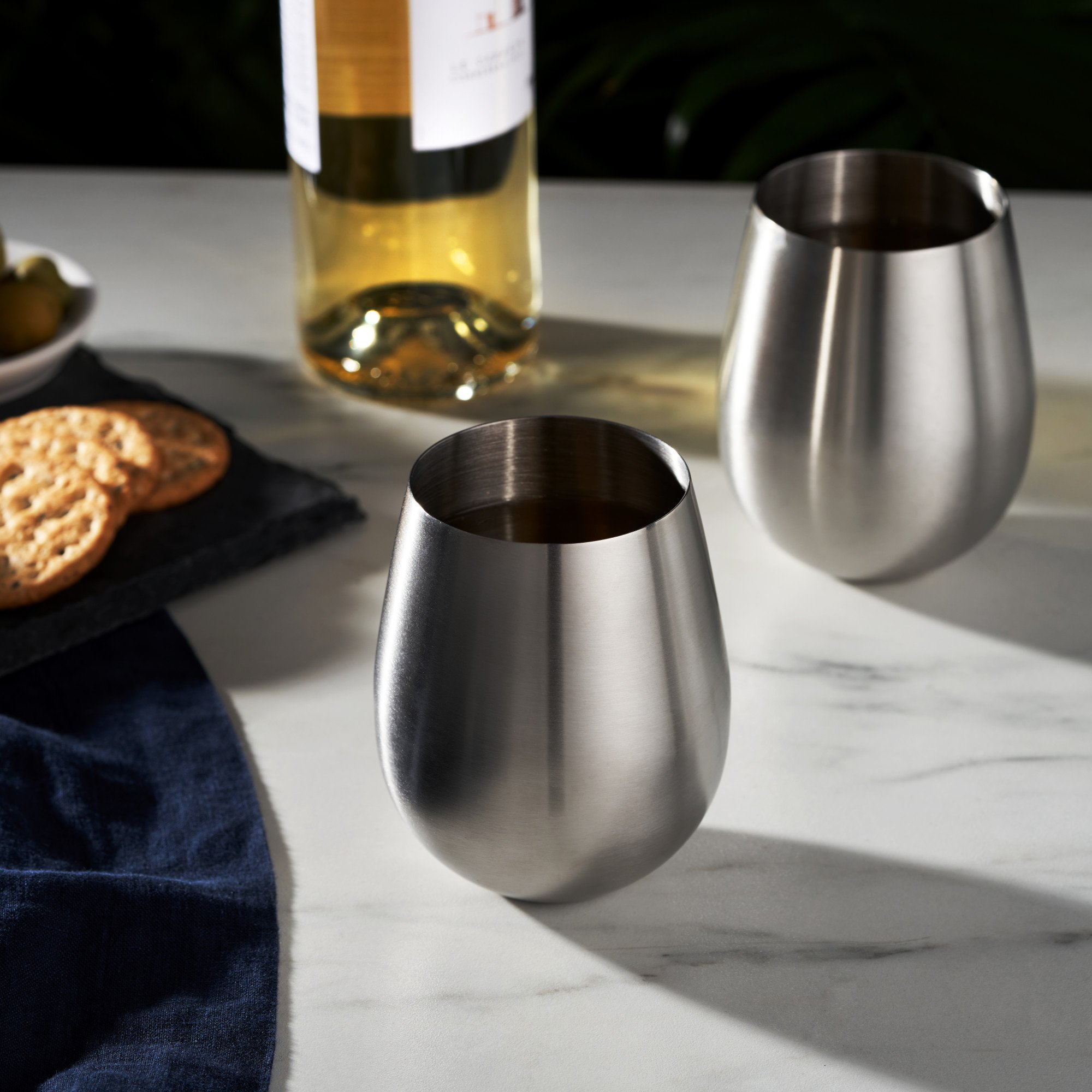 Sip fine wine and rich spirits alike from stainless stemless tumblers, each one polished and rounded to fit perfectly in the curve of your palm as it collects and intensifies the aromas of your drink.