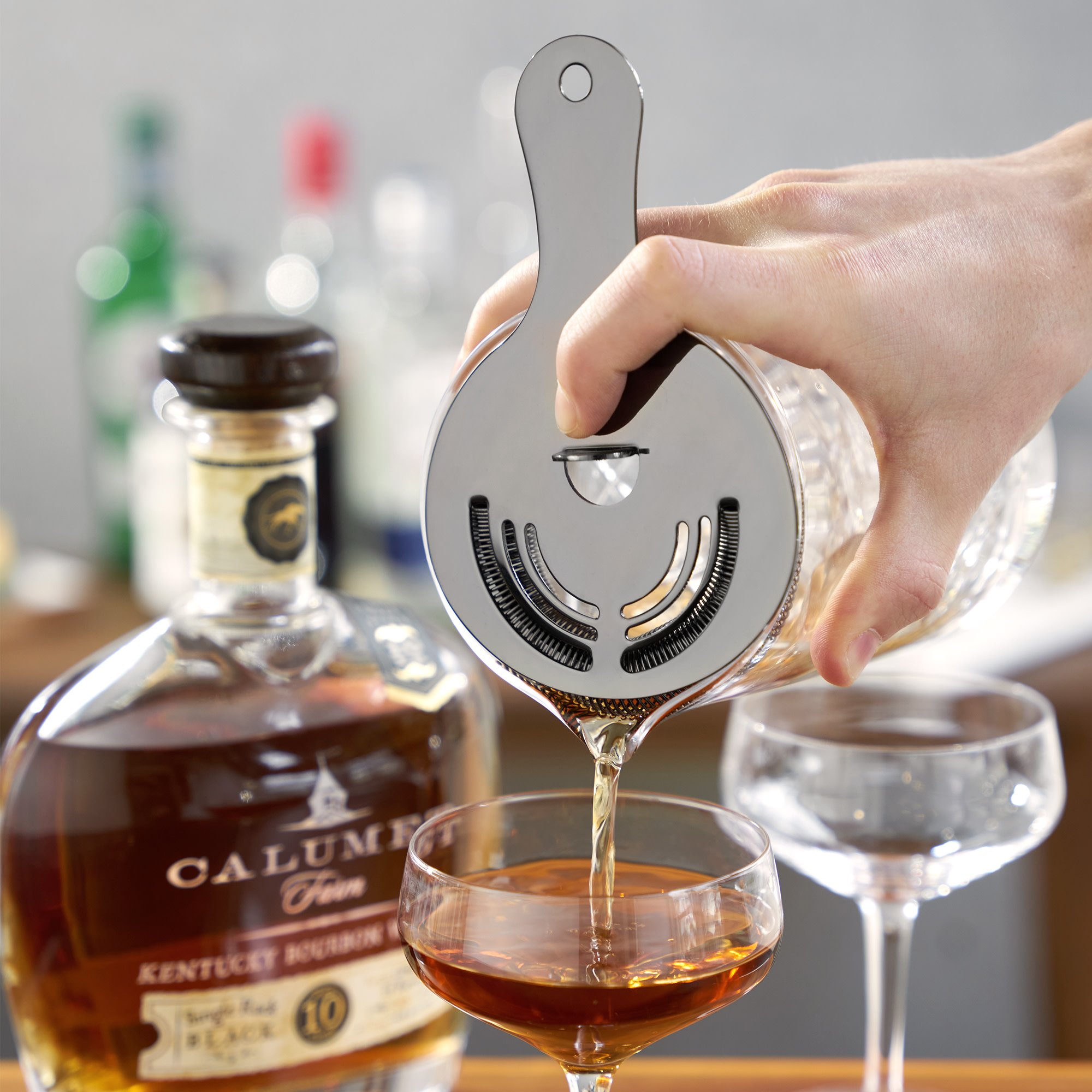 • STREAMLINED STYLE - The flat handle and broad face give this strainer a sleek, minimalist look while the tightly coiled spring and twin slots make for precisely filtered cocktails. Upgrade your bar cart with this contemporary take on a barware essential.