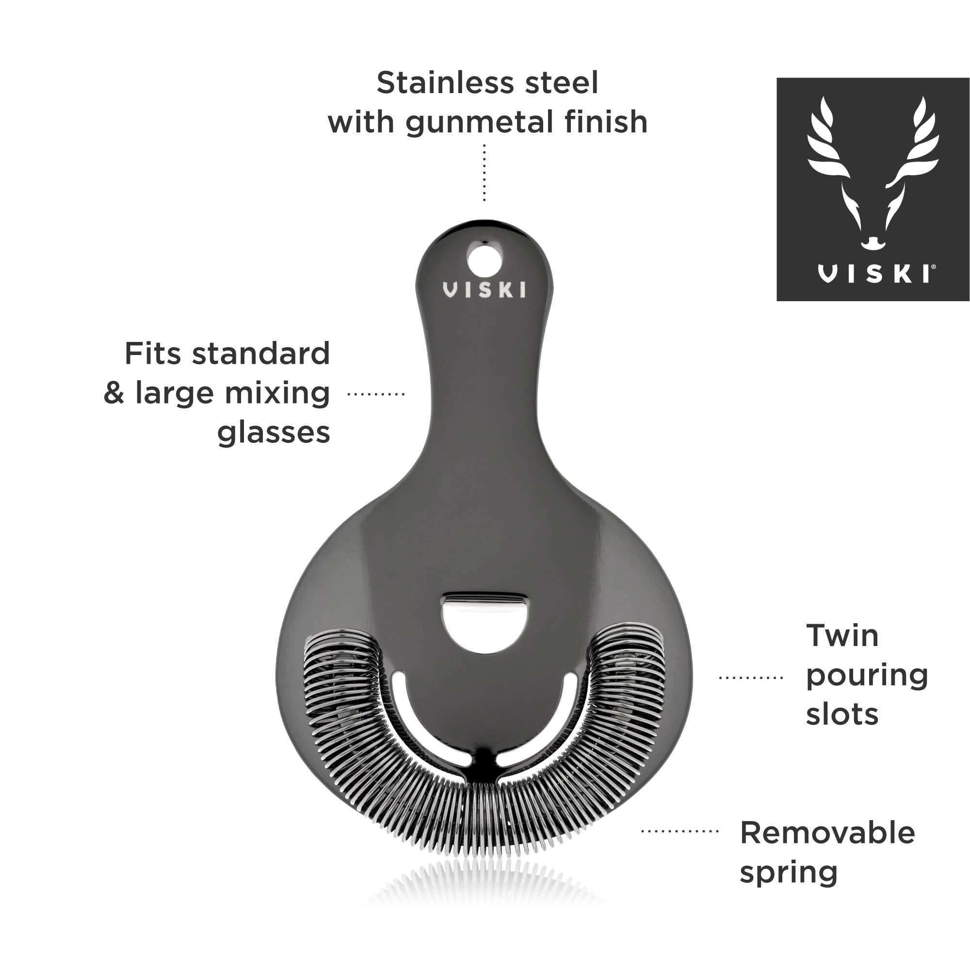 • QUALITY MATERIALS - Crafted from high quality stainless steel with a sophisticated black gunmetal finish, this strainer fits large and standard mixing glasses while two sets of perforations make split pours second nature. Designed with a removable spring.