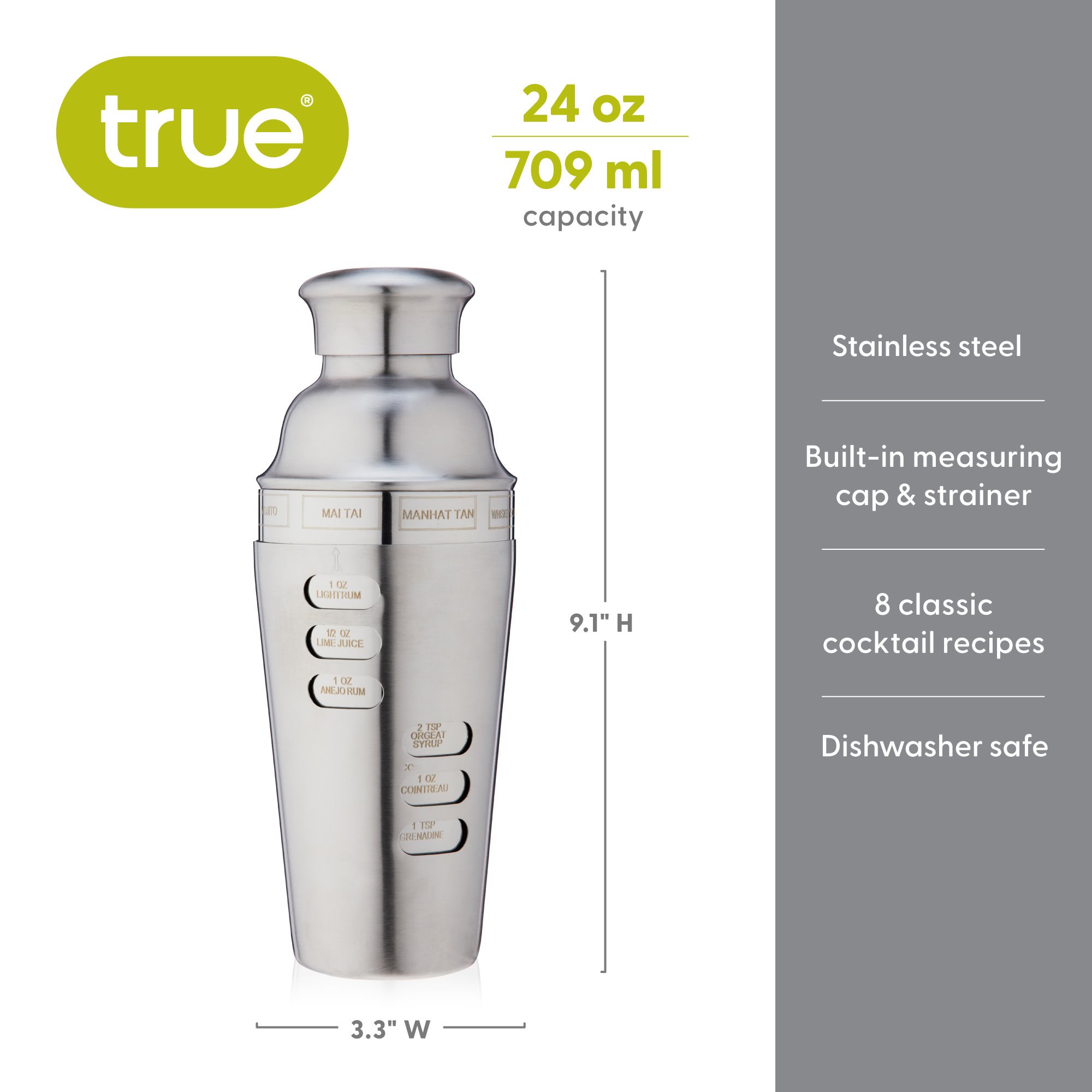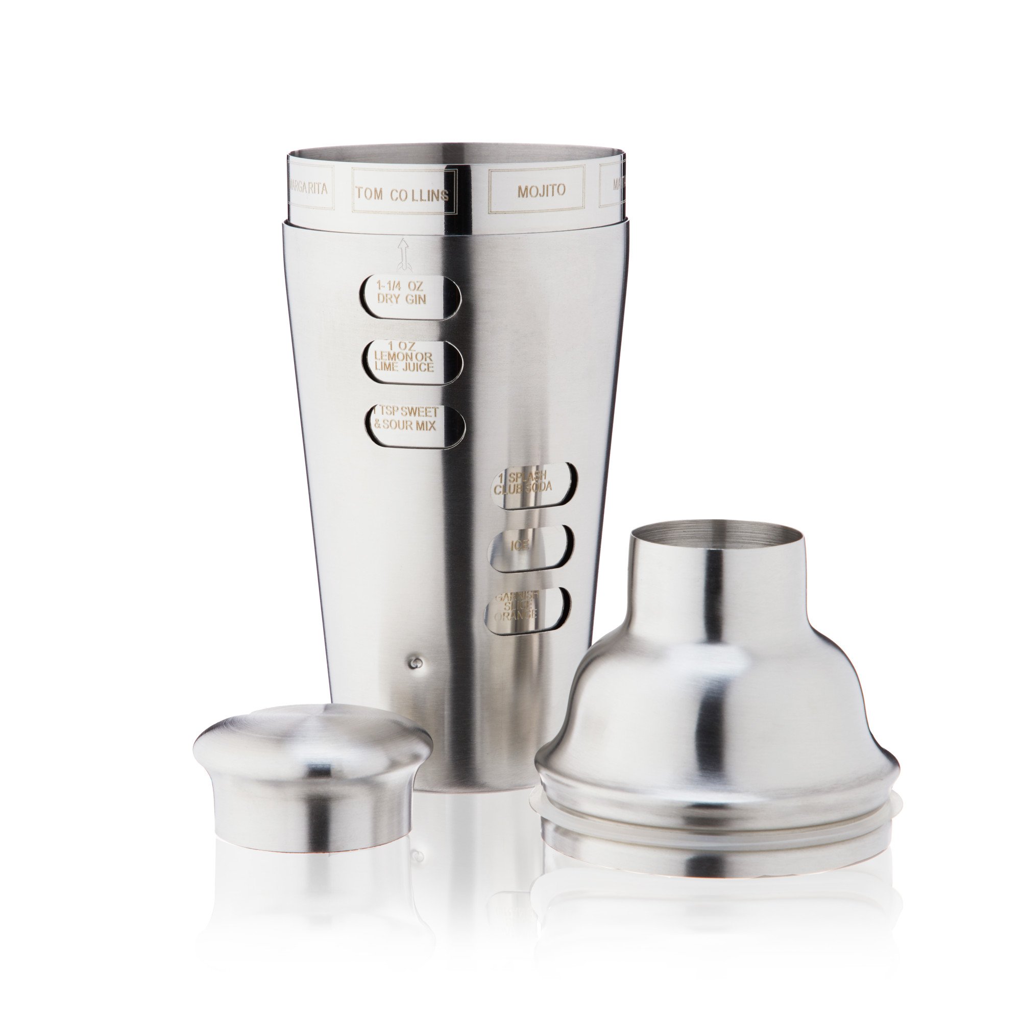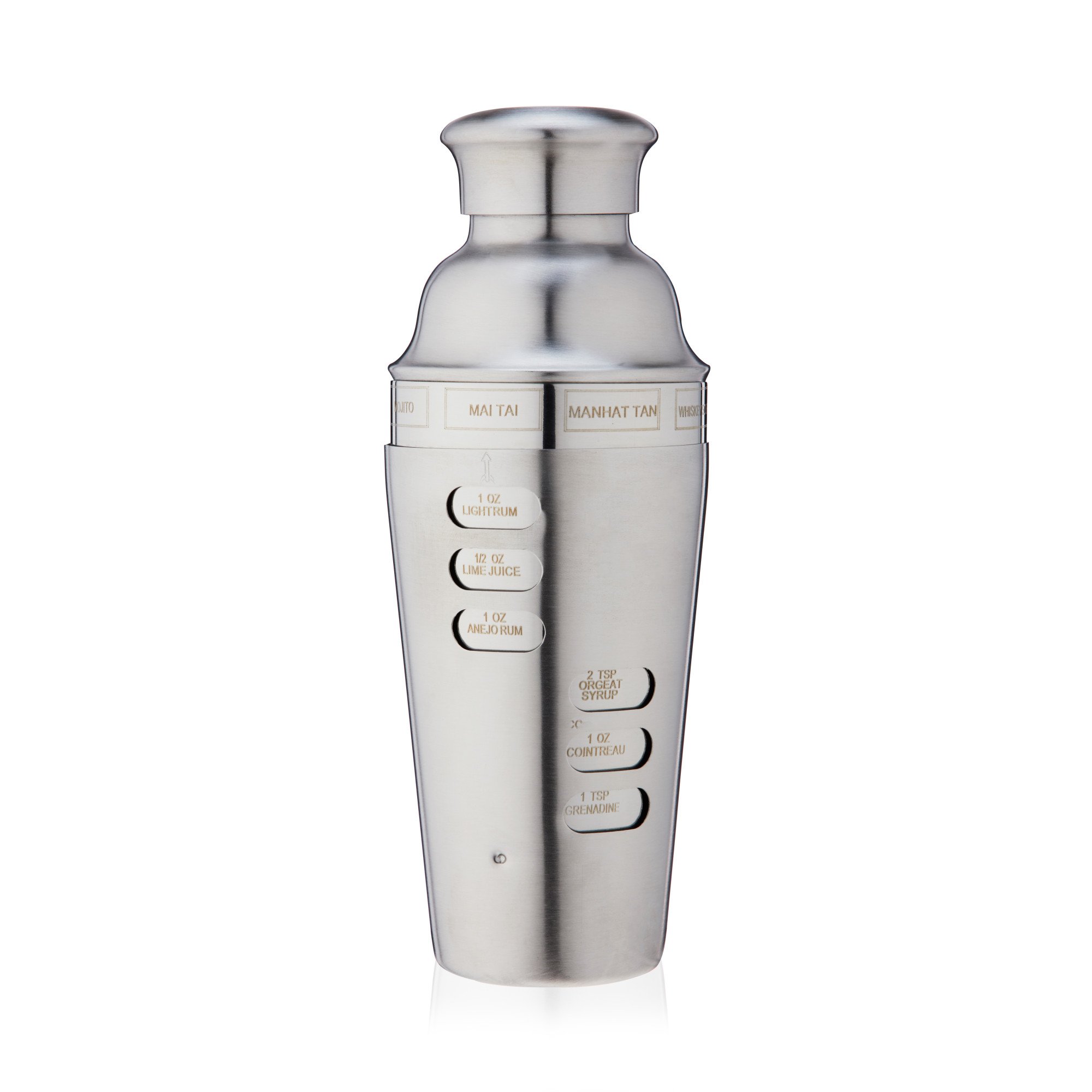 • ELEGANT & PRACTICAL - This cobbler shaker has a twist—just swivel the outer wall to reveal recipes for 8 classic cocktails! Nail the ratios for Mojitos, Mai Tais, Manhattans, Whiskey Sours, Martinis, Cosmopolitans, Tom Collins, Margaritas, and more.