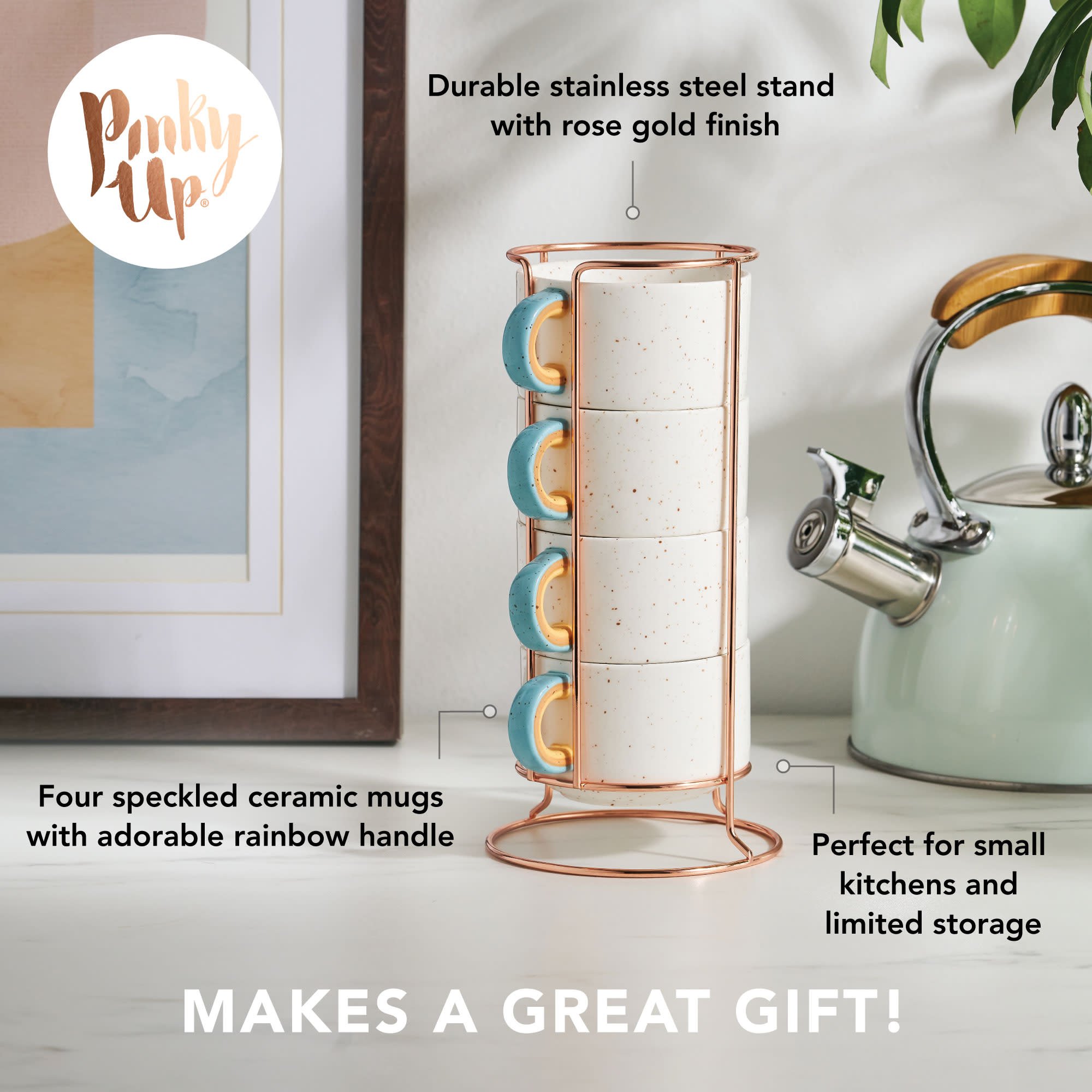 Introducing the Pinky Up Arc Mugs, a thoughtfully designed stackable coffee mugs set of 4 with stand, and a perfect addition to your kitchenware! These ceramic 10 oz mugs are great for your morning latte, evening cup of tea, or even a soothing cappuccino at any time of the day. Each cup has a colorful rainbow handle that brings an extra charm to your morning coffee or evening tea. The stackable design of these espresso cups stackable is perfect for small kitchens and limited storage spaces. These stackable coffee mugs with rack are made from superior quality ceramic, ensuring durability and longevity. Each mug with a speckled finish that gives it a unique and beautiful look. With this stackable mug set, your coffee or tea time will be more enjoyable. Set of 4 coffee mugs is also perfect for entertaining guests. Our stackable mugs with stand are a combination of functionality, style, and convenience. They are an ideal choice for those who appreciate the beauty of stacking mugs and the practicality of coffee cups with stand. Get your Pinky Up Arc Mugs today and experience the charm of stacked coffee mugs with stand.