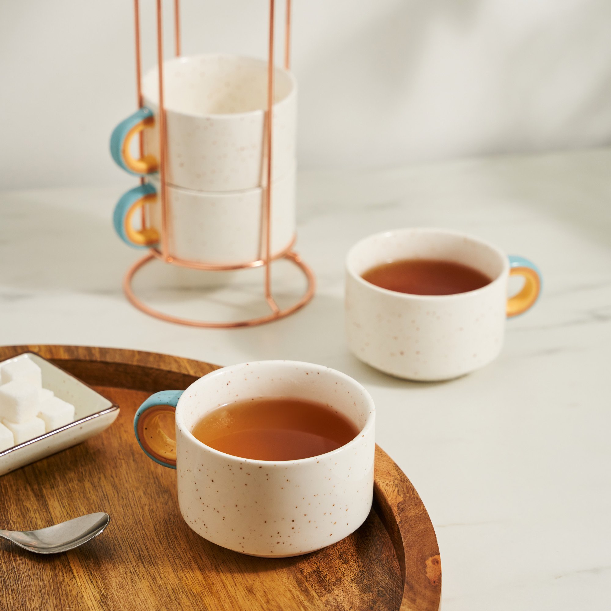 • HAND WASH - These stackable mugs with stand are speckled and stackable, adding a unique touch to your coffee cups set of 4. Please note these stacked coffee mugs with stand are hand wash only.