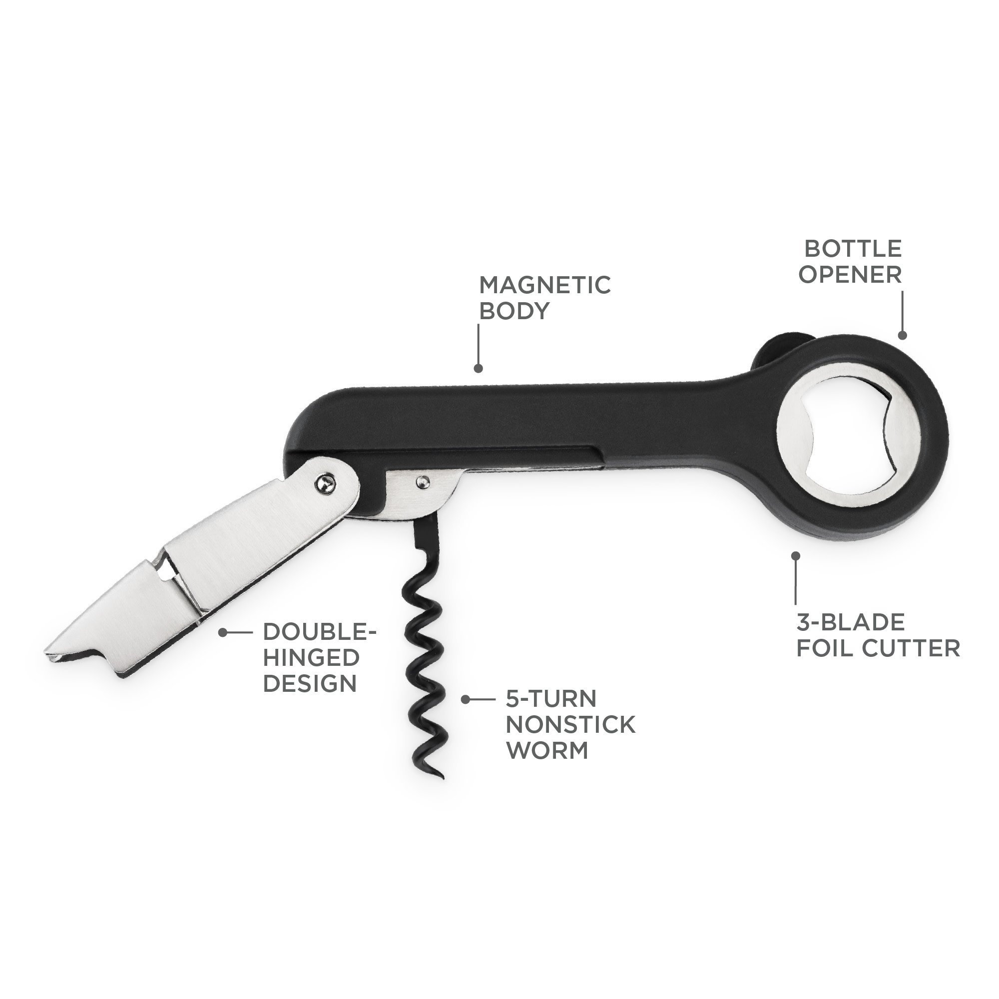 • THE PERFECT WINE KEY - Where form meets function. This double-hinged corkscrew sports a bottle opener, 3-blade wine bottle foil cutter, 5-turn non-stick worm, magnetic body, and black finish. You'll want this all-purpose corkscrew on your bar cart.