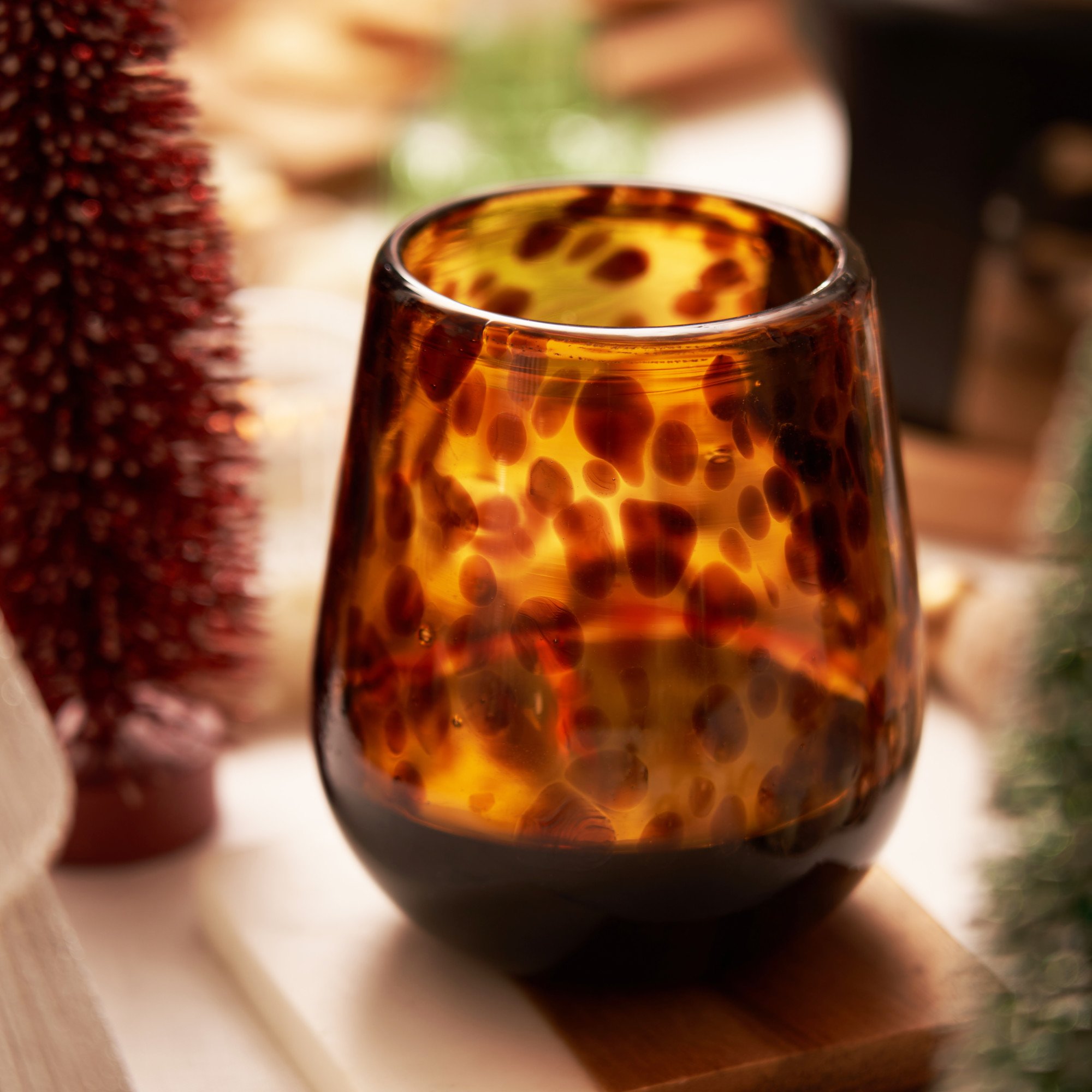 Beautiful red wine glasses add a unique touch to your table. This amber speckled stemless wine glass set celebrates the art and traditions of Mexican artisans and is hand blown from recycled glass.