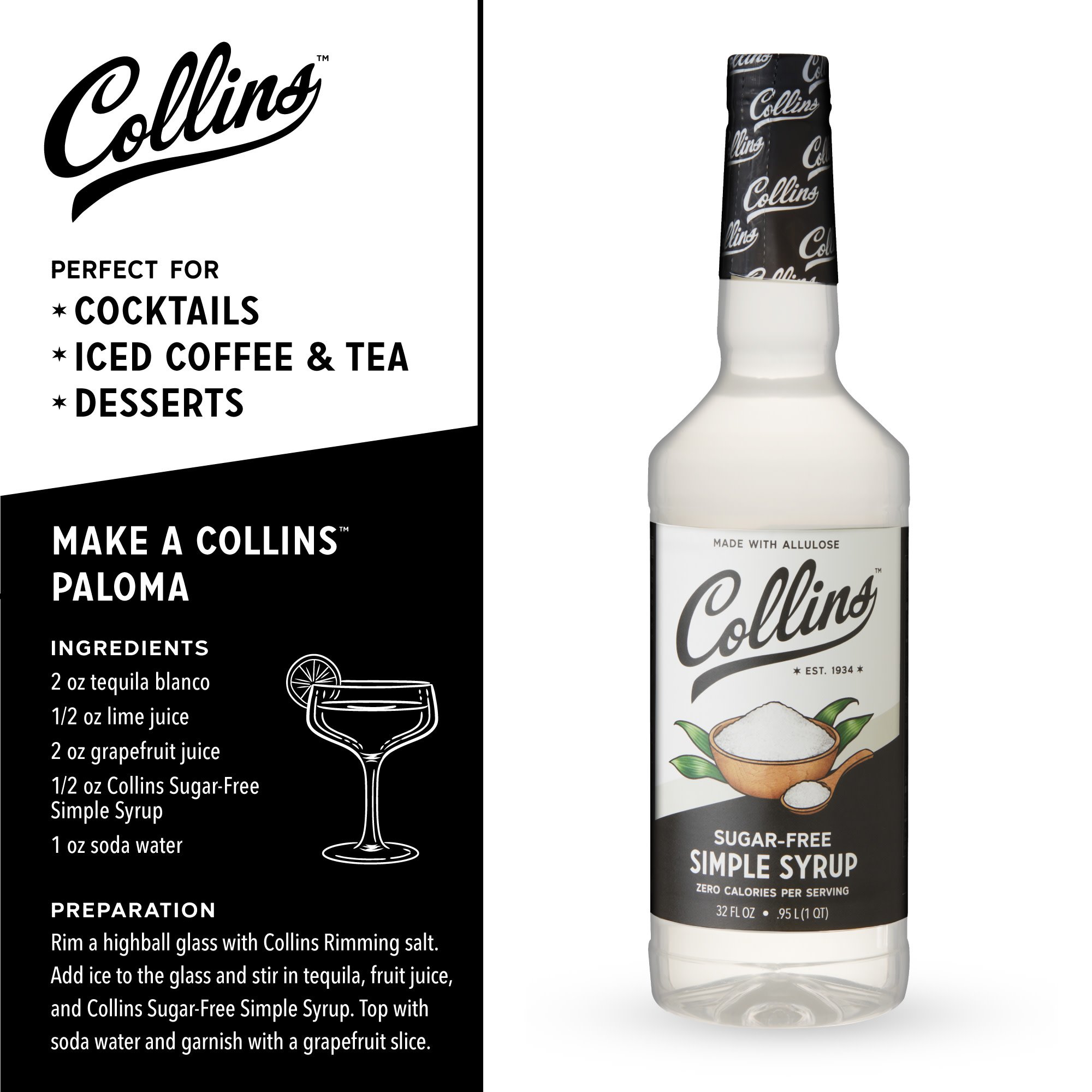 • SUGAR FREE SIMPLE SYRUP FOR DRINKS - Collins Sugar Free Simple Syrup cocktail ingredient is a bar staple. Made with allulose, a naturally sweet alternative to sugar, it doesn’t change the flavor of your drink or leave an aftertaste.