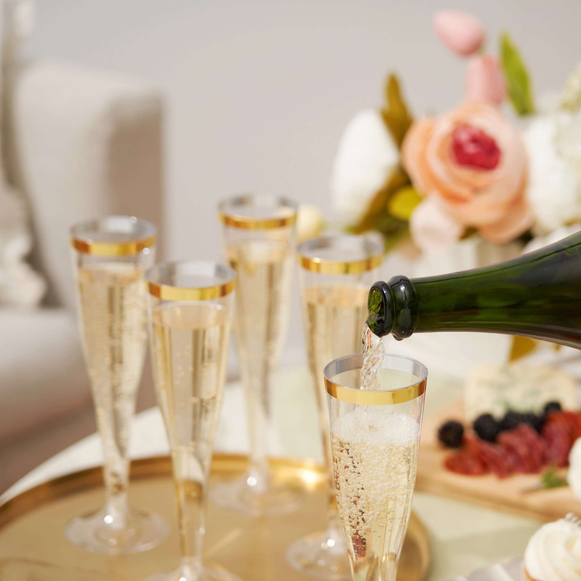 Introducing the True Gold Rimmed Disposable Champagne Flutes – the perfect blend of elegance and convenience for your next celebration! With a crystal-clear body and a luxurious gold rim, they add a touch of sophistication to your event without the hassle of traditional glassware. No more worrying about broken glass at your kitchen bar or bar glassware disasters. These champagne flutes plastic collection promises durability while maintaining the aesthetic of modern glassware. Each flute holds 5.5oz, just the right size for enjoying Champagne, or Prosecco. Consider these plastic flutes for your next cocktail night, as they effortlessly transition from formal to casual settings. They are also a great choice for outdoor events where traditional bar glasses might not be suitable. Imagine sipping on a sparkling drink while enjoying the ease of cleanup these plastic party glasses offer – just enjoy and dispose! These are more than just drinking glasses; they're a celebration of style and practicality. Make every toast count with these chic bar accessories. Whether it’s a prosecco toast at brunch or a champagne cheer at a party, these plastic glassware gems will have you covered, ensuring your celebrations are as sparkling as your drinks!
