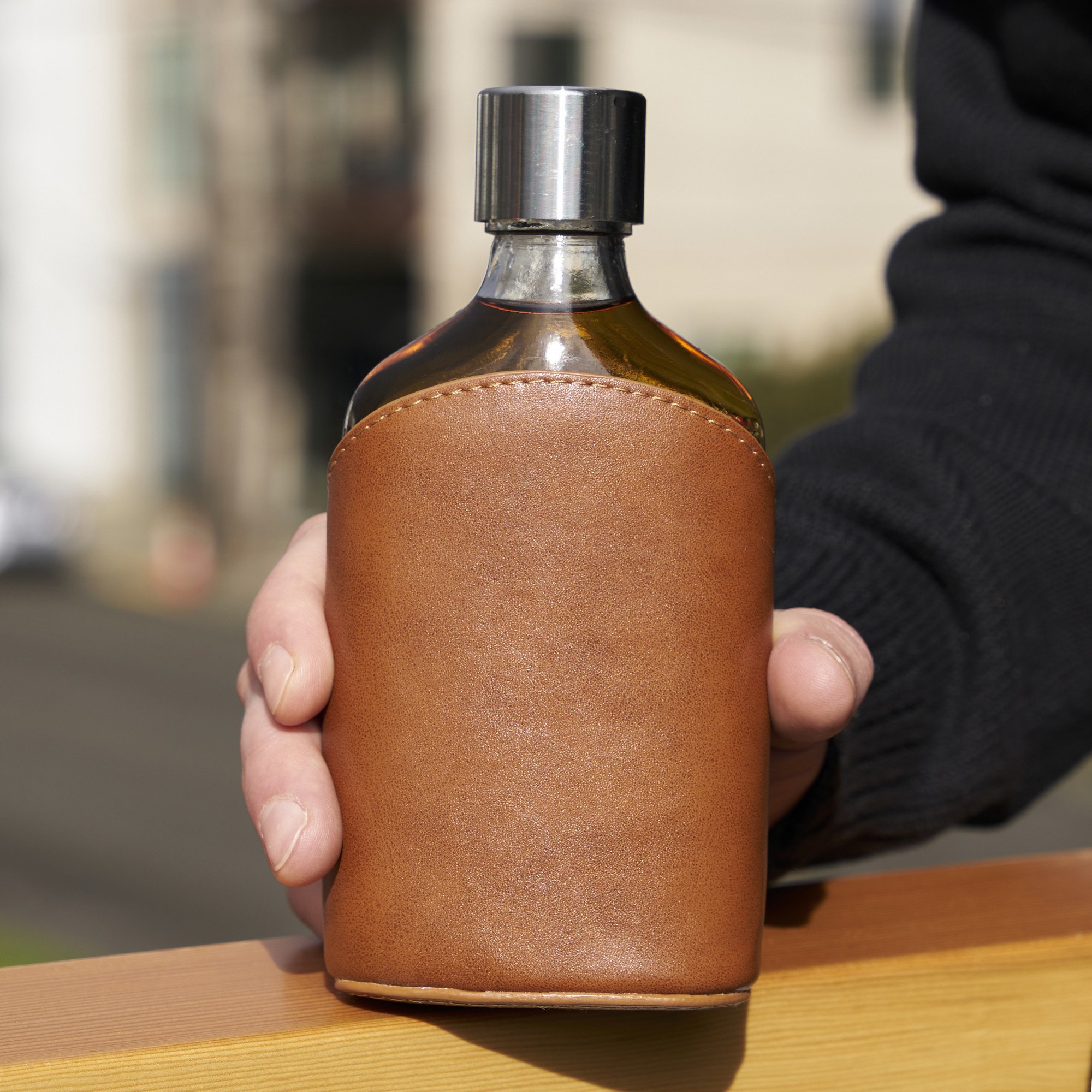 • GLASS FLASK LEATHER POUCH - Both classy and classic, this glass flask is fun to drink out of and a good conversation piece. Glass is better for drinking whiskey, liquor, or cocktails than stainless steel, and the leather pouch protects your flask.