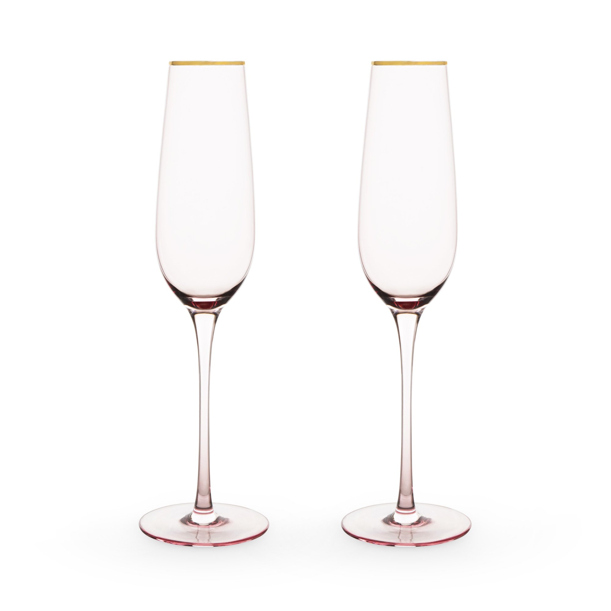 Sip your wine through rose tinted glasses. These pale pink sparkling Champagne flutes give an extra rosy hue to your favorite Champagne, Prosecco, or sparkling rosé, and the electroplated gold rim adds extra sparkle to your bubbly. Set of 2 rose-tinted crystal sparkling wine glasses. 8 oz. capacity. Gold rimmed.