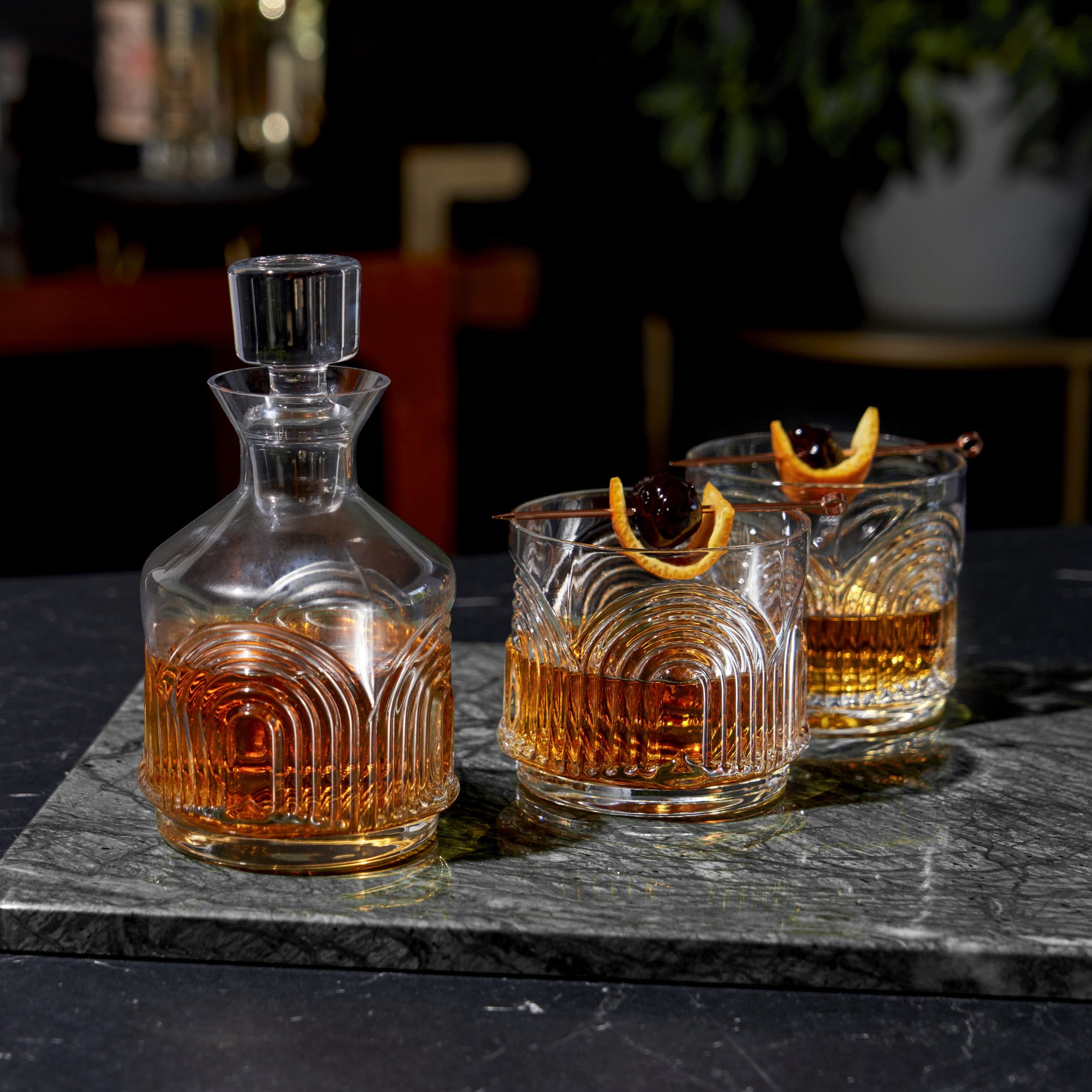 A repeating rainbow motif pressed into lead-free crystal gives these textured tumblers Art Deco decadence. Paired with a matching petite liquor decanter, this stackable barware saves space on your bar cart and adds some Gilded Age style to your glassware collection.