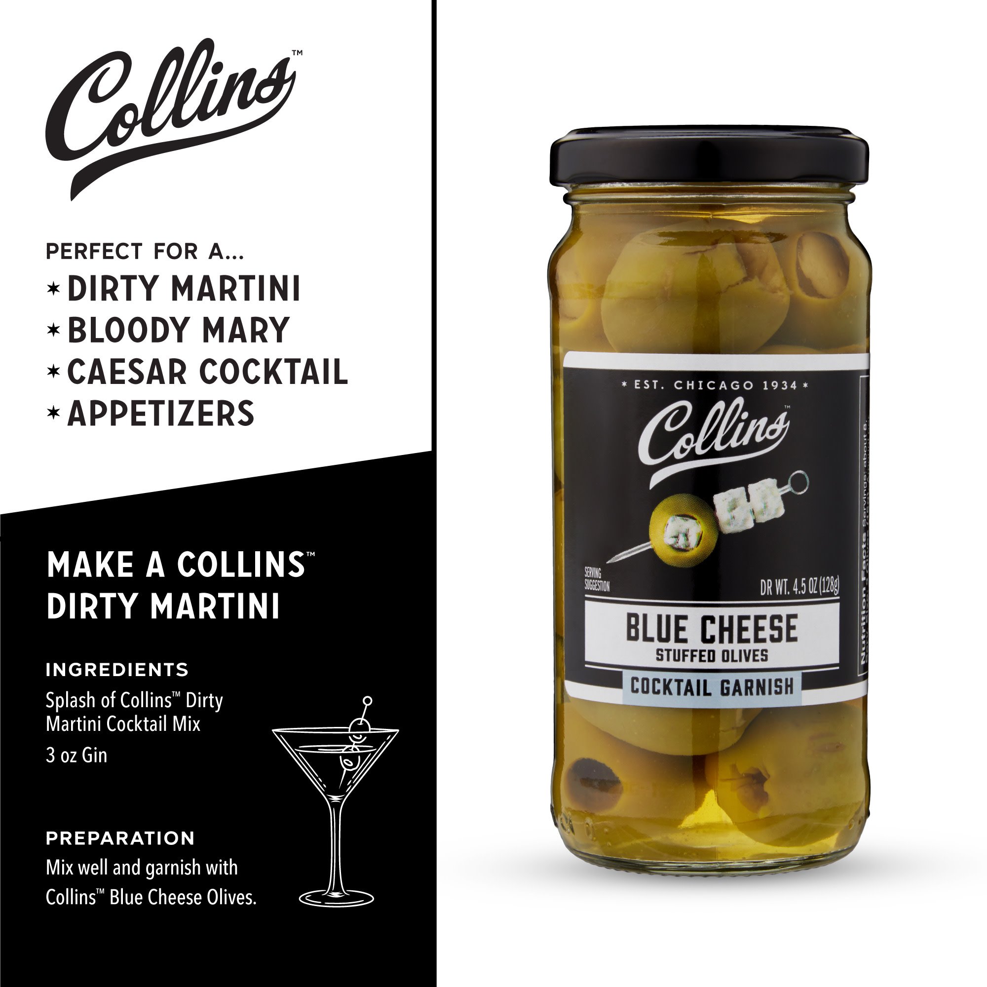 Gourmet Blue Cheese Olives – Looking for olives that pack a punch? You’ll love these blue cheese stuffed olives from Collins. The olives are generously-filled with a pungent blue cheese that is rich in both flavor and character, which adds Mediterranean flavor to the classic cocktail. They are ready to use straight from the jar, where they can be plopped into any cocktail or drink. You can also enjoy these olives as a starter dish or a side dish during a social gathering If you want to create the perfect Martini, you need olives that won’t let you down. Your favorite cocktail shouldn’t just be thrown together; it should be crafted to absolute perfection in both taste and design. The Gourmet Blue Cheese Olives are the perfect garnish for adding authenticity and extra flavor. The Collins Way – The year is 1934, and on North Clark Street in Chicago, Collins Brothers have just opened their doors to sell a simple metal bottle opener and homemade grenadine. Since then, Collins Brothers has expanded their range to include a variety of garnishes, mixers, and syrups. Being recognized for outstanding service has remained at the forefront of our brand philosophy, and always will. In the unlikely event that you’re not satisfied; we’ll replace your olives or return your money. Fantastic Gift – These gourmet cheese olives ideal for Christmas, birthdays, anniversaries, or as a special treat for that cocktail-lover in your life. They are also the perfect item to take to any dinner party or evening gathering.