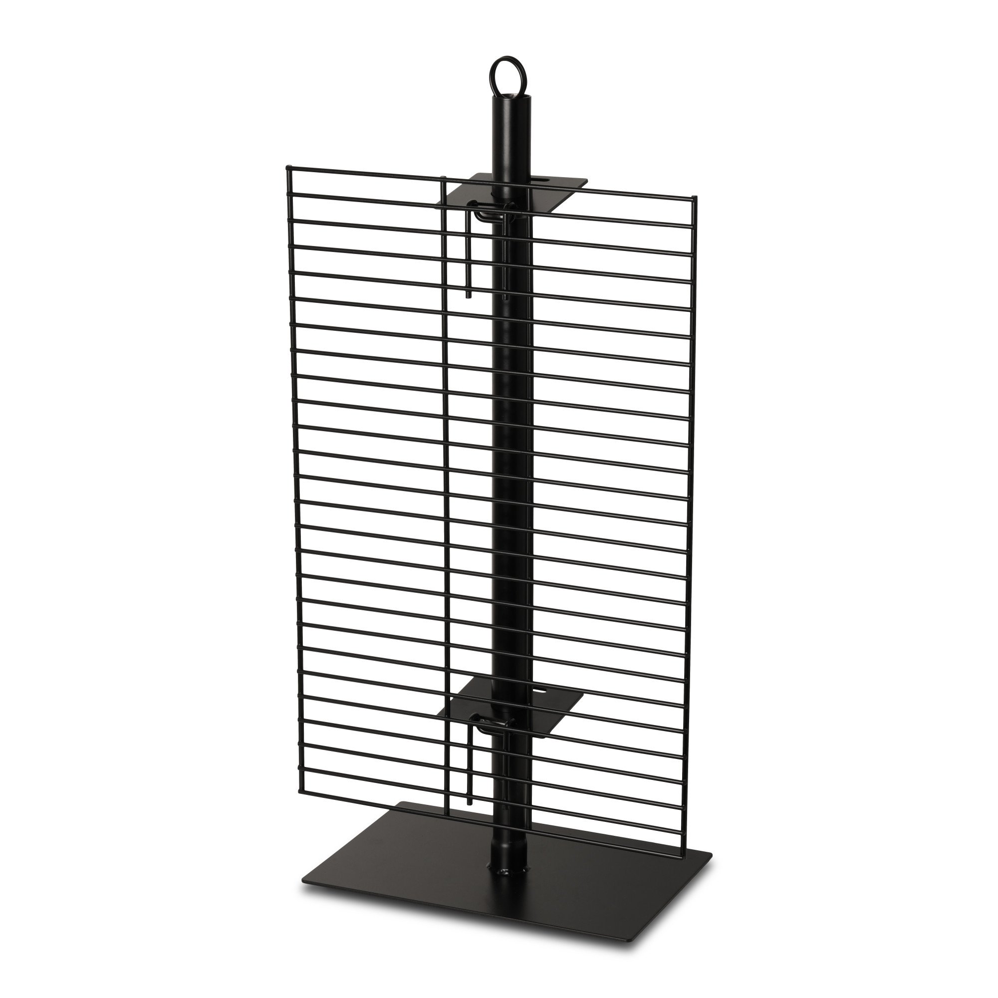 This countertop spinner rack offers a sleek, efficient solution for displaying a variety of barware, accessories, and other impulse buy products. With a compact design, sturdy black finish, and 12 included hooks, it maximizes space while providing easy access to items. Ideal for retail stores, it keeps merchandise organized and visible to customers.