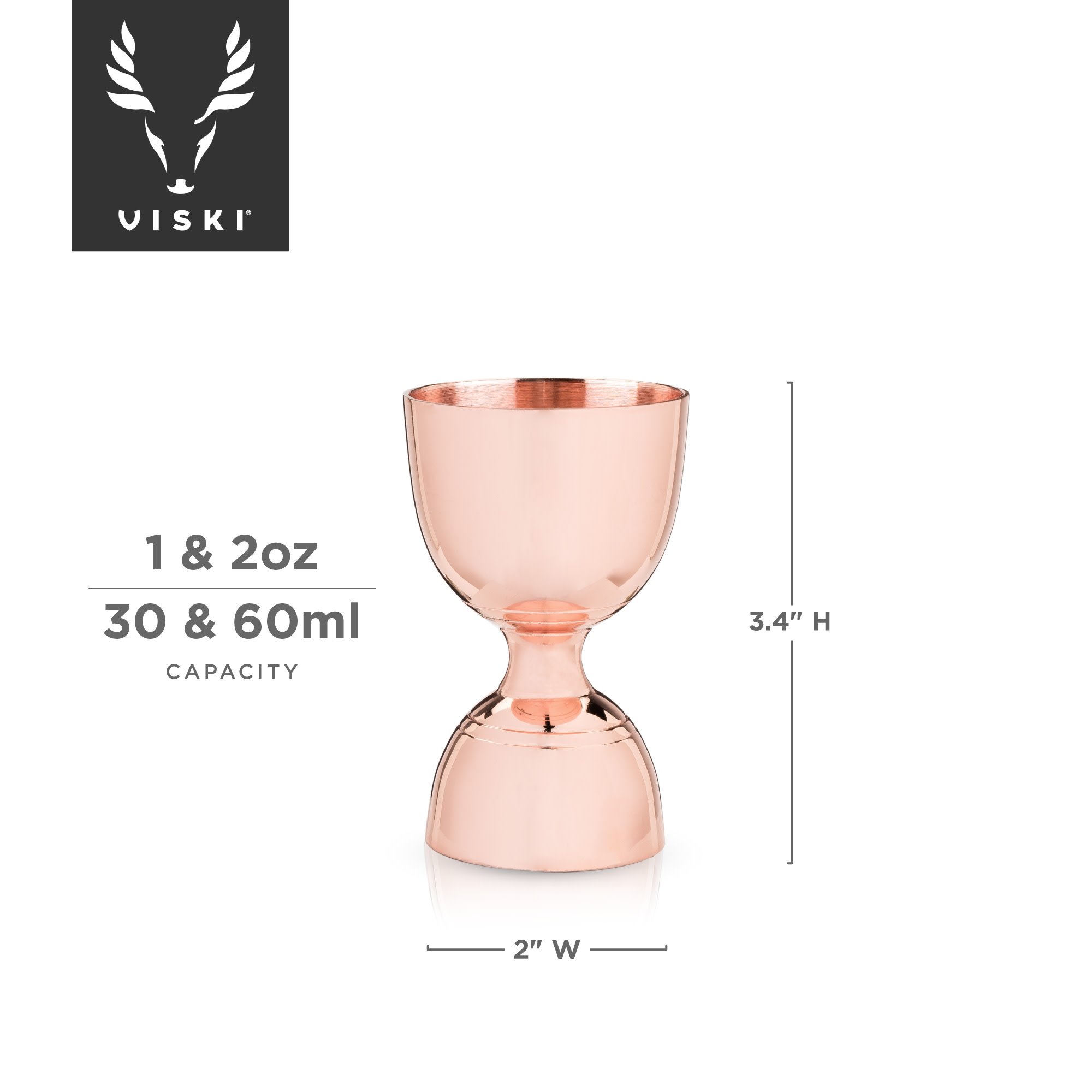 • BAR MEASURING JIGGER 1 AND 2 OZ - A double-sided shot jigger lets you easily measure while making multiple drinks. With a band that separates the 1- and 2-oz sections, the interior of this copper jigger for bartending is marked for the perfect pour. Hand wash.