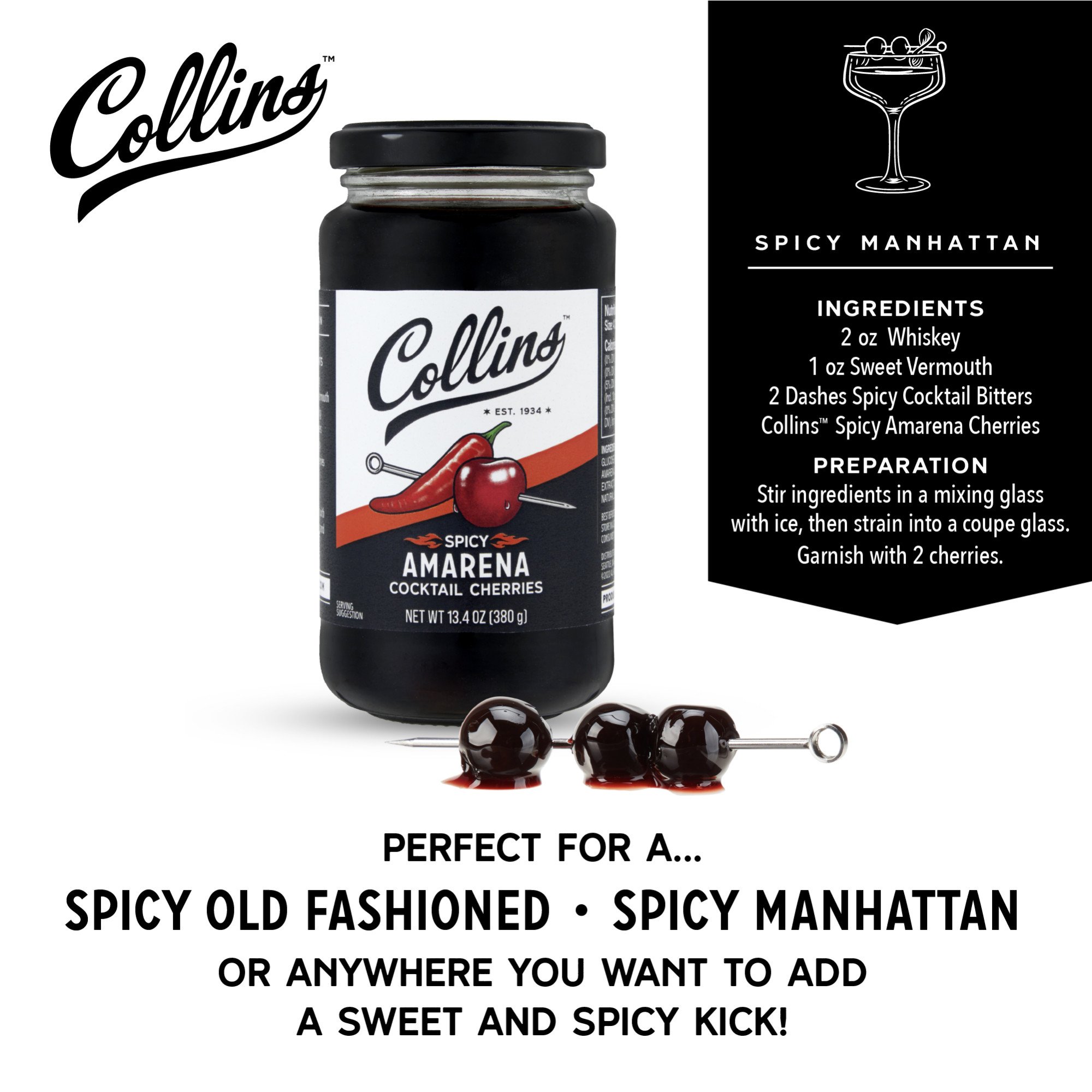 Collins Spicy Amarena Cherries are the perfect way to elevate an Old Fashioned or Manhattan. Crafted from Italian cherries in sour cherry juice, these cocktail cherries have a hint of chili that adds a little kick to your drink. Collins garnishes and mixers are always made from real ingredients for real flavors—taste the difference. Ingredients: Cherries, Glucose-Fructose Syrup, Sugar, Amarena Juice, Citric acid, Extract of carrot and hibiscus, chili natural flavoring.