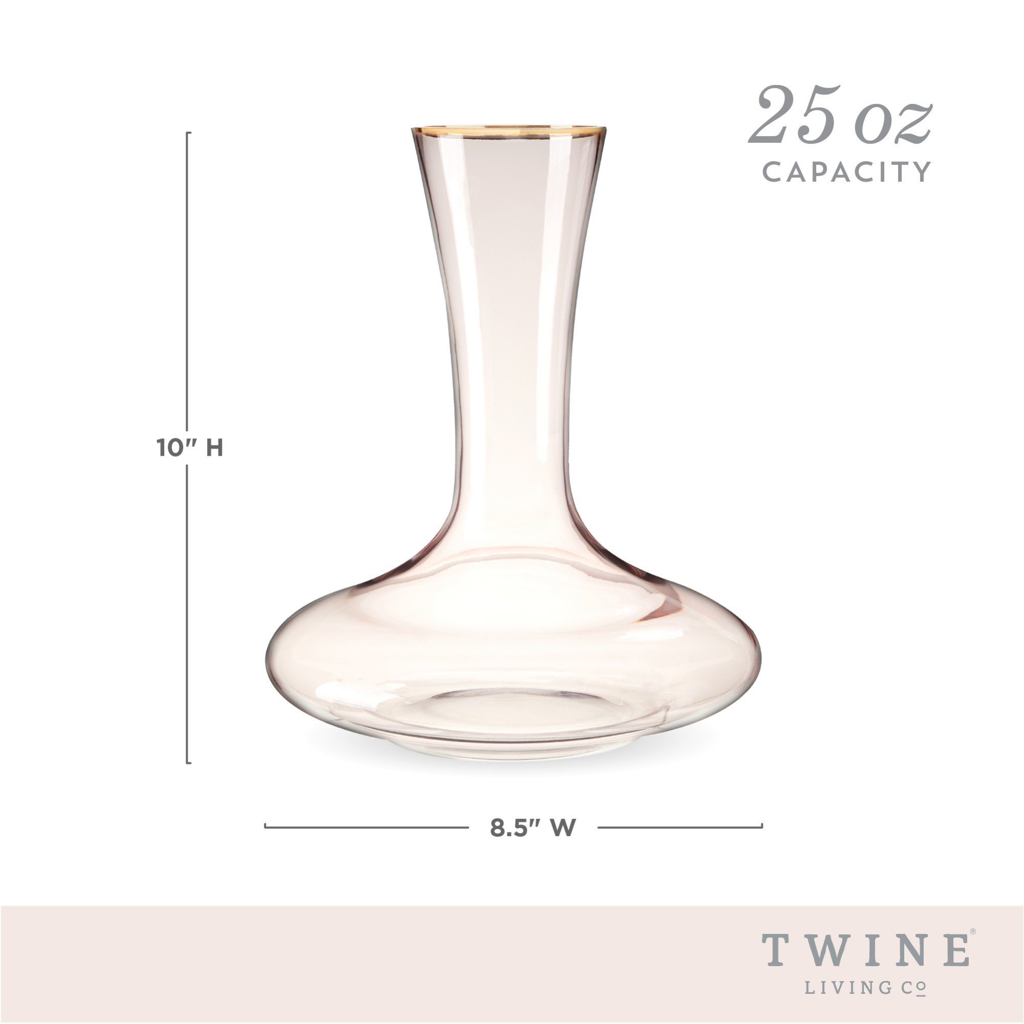 Life looks a lot rosier when you pour your wine from this rose-hued decanter. Tinted a delicate pink with a gilded rim, this crystal decanter is the perfect vessel for aerating and serving your favorite vintages. Lead-free crystal. Pink with gold rim. Fits 1 standard wine bottle.