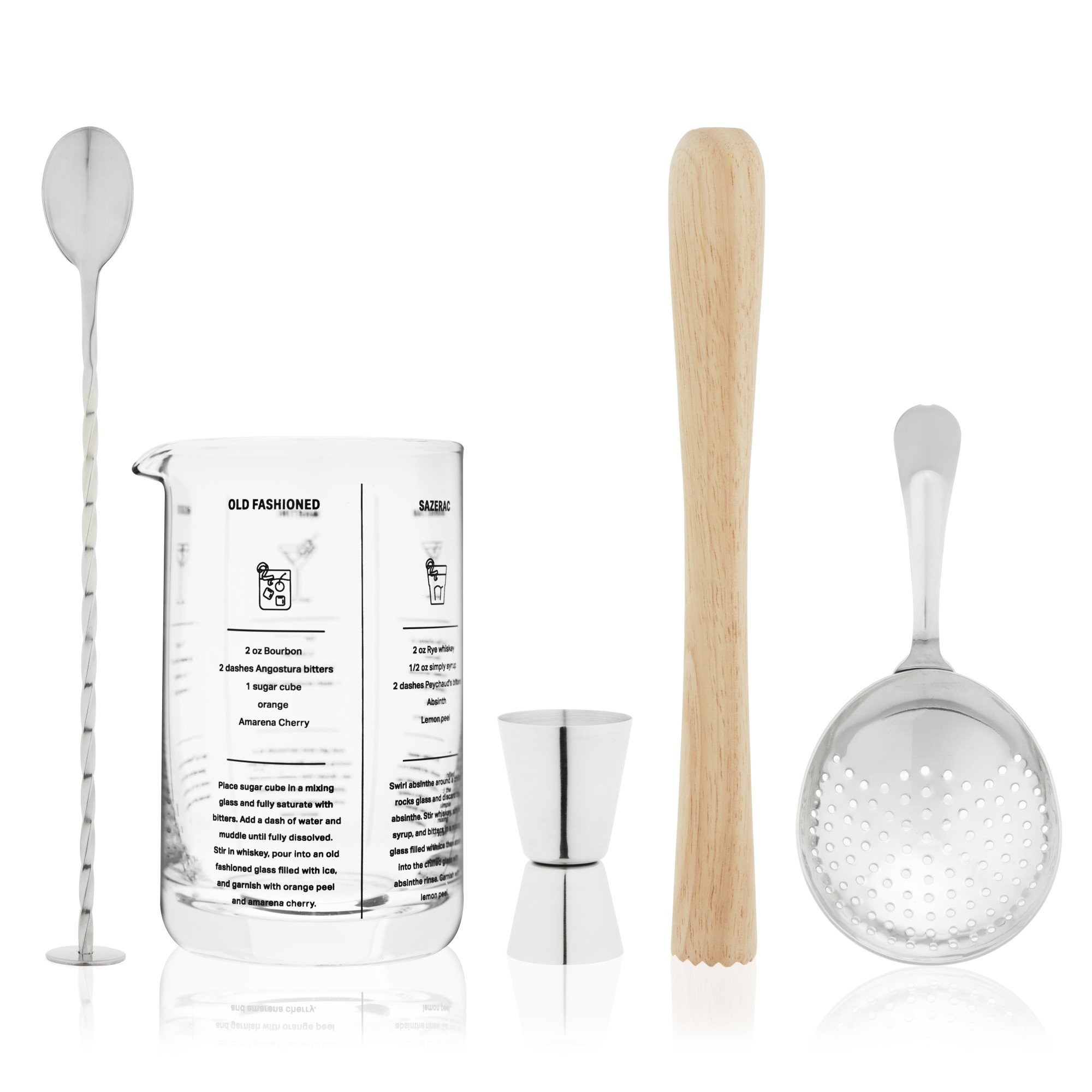 • ULTIMATE COCKTAIL MIXING SET - Flaunt your bartending skills with our cocktail mixing glass set! The 5 piece set includes an old fashioned muddler, julep strainer, double jigger, bar spoon, and cocktail mixing glass with 5 cocktail recipes.