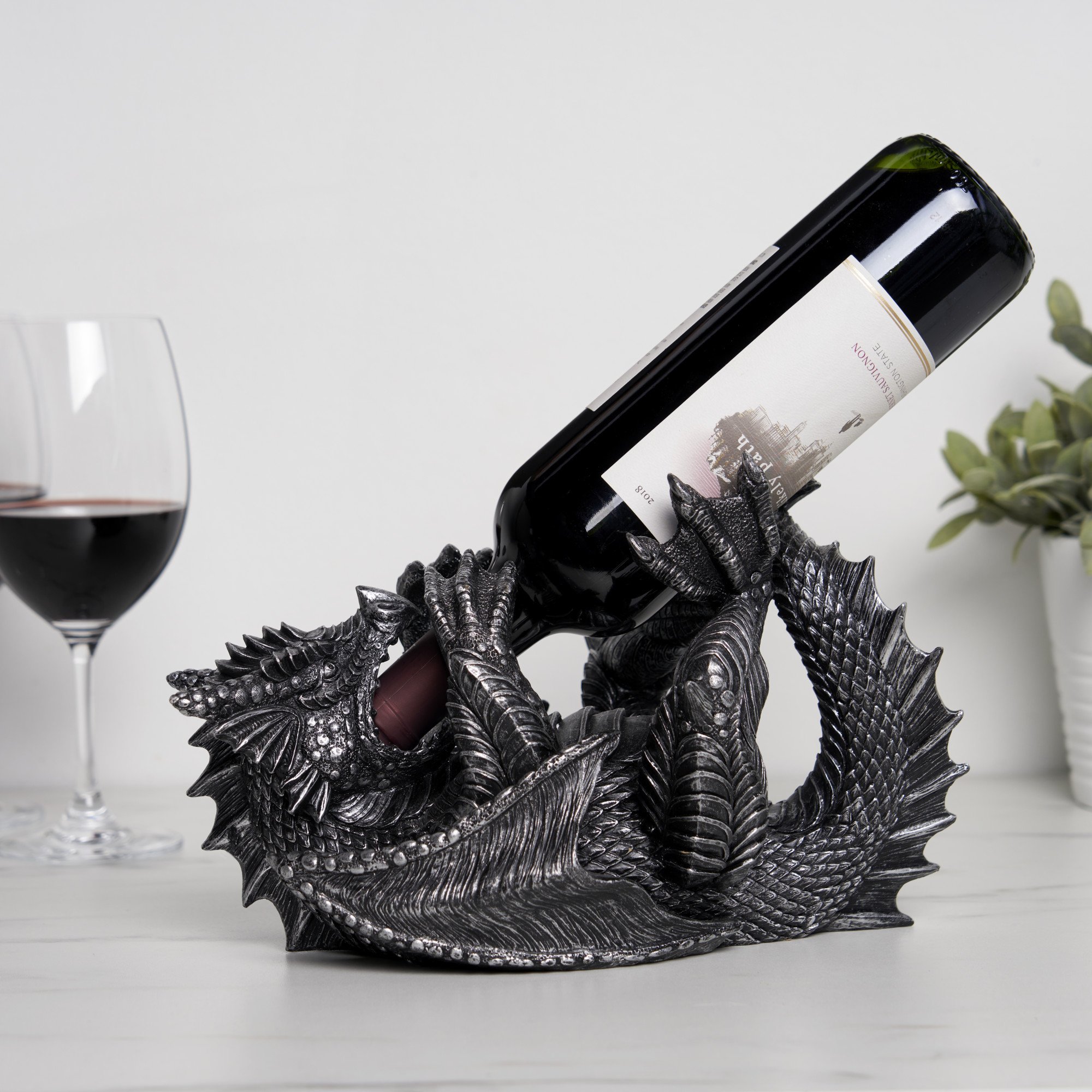 • ADD AN EXCITING, CONVERSATION-STARTER TO YOUR HOME BAR - This dragon wine bottle holder showcases a super detailed and realistic pewter style with solid, quality construction. While looking dramatic, at 7 inches high the dragon itself easily fits on most counters or tables, with most of the height created by the bottle itself.