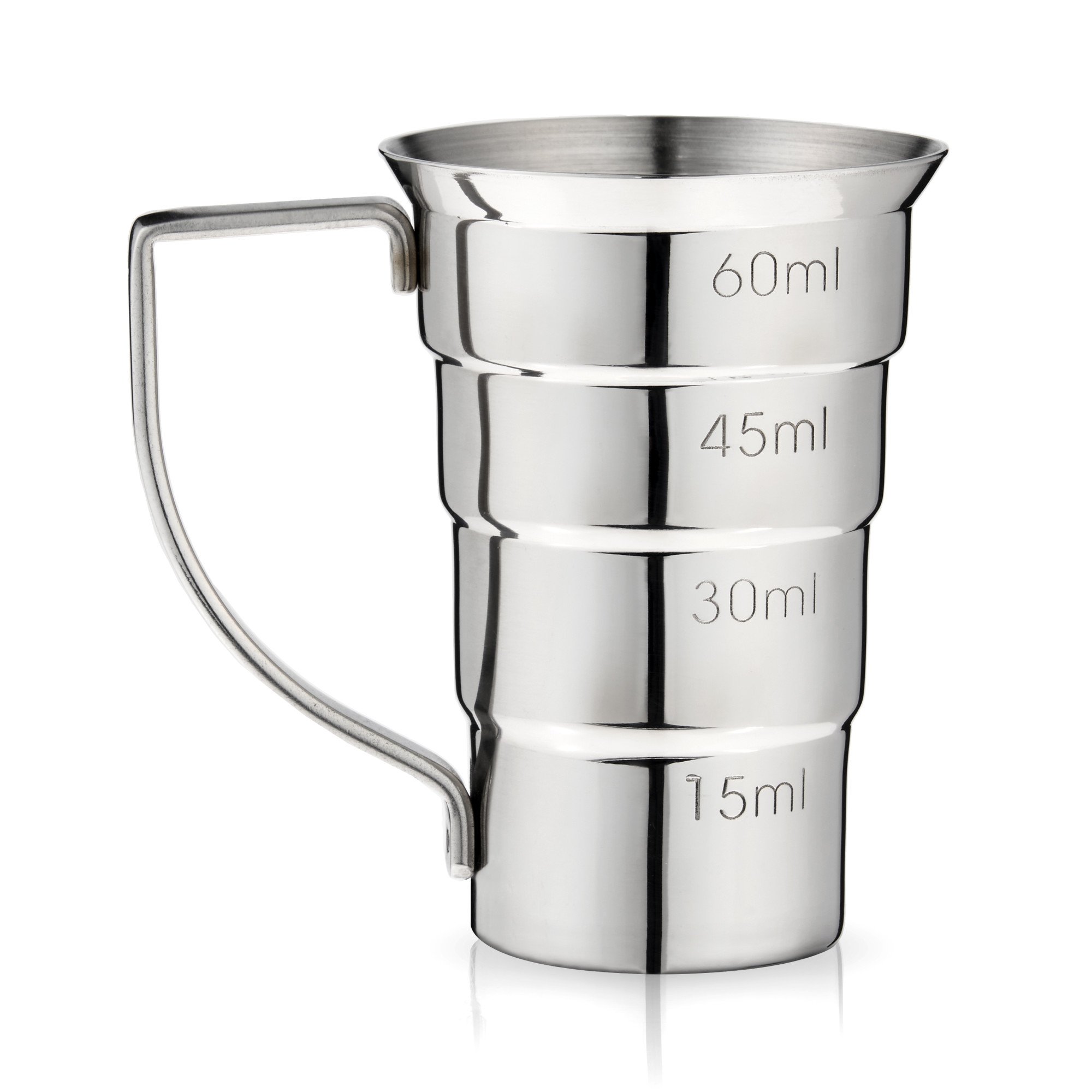 • PROFESSIONAL GRADE STAINLESS STEEL - Stainless steel barware is durable and timeless, showcasing style without any extra frills. This stepped jigger with a convenient handle will fit right in with professional grade barware or stainless steel accessories.