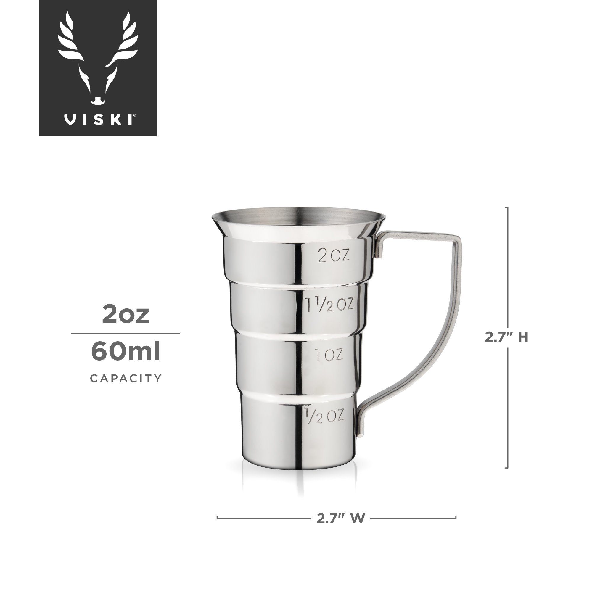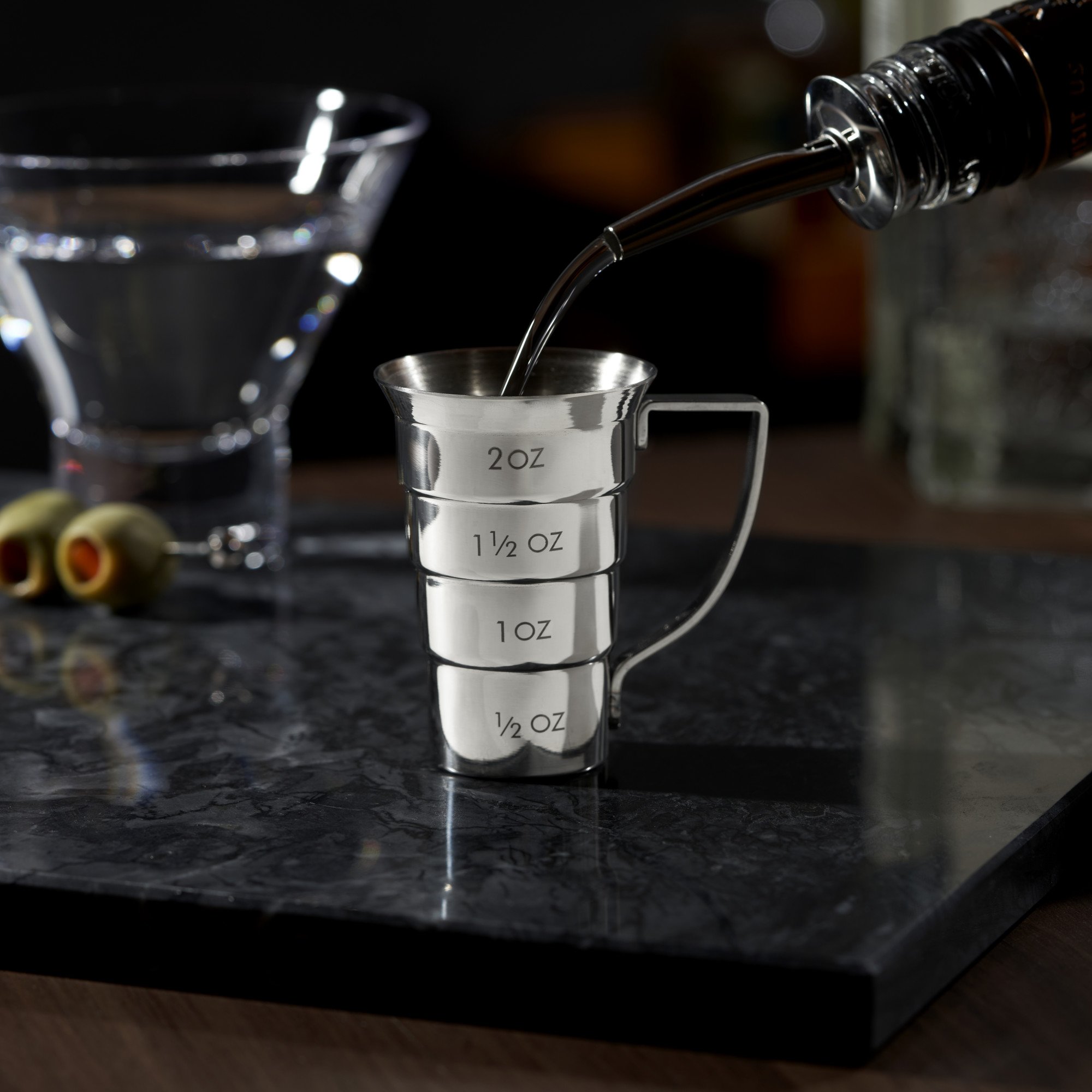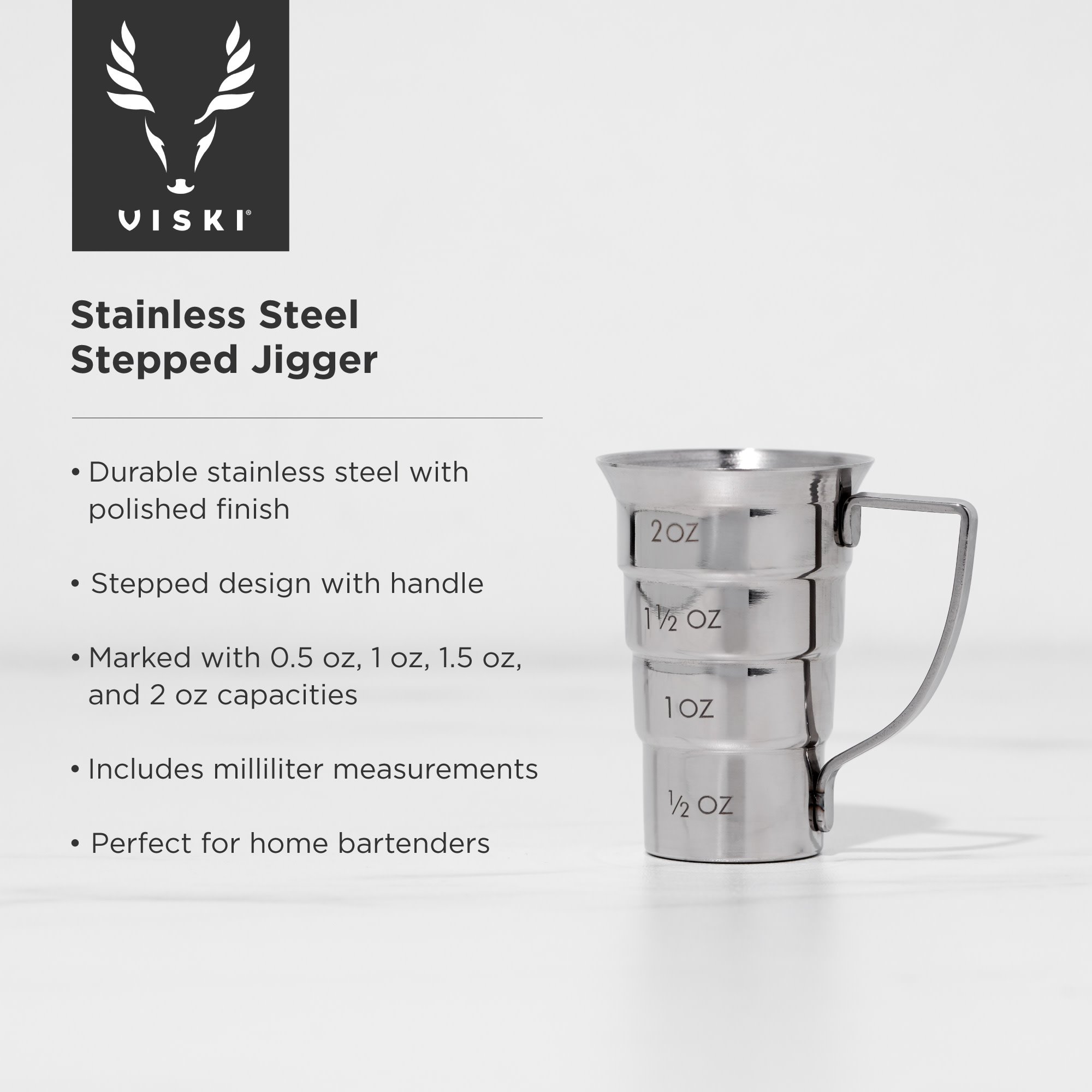 Take your barware to the next level with the Stainless Steel Stepped Jigger by Viski® Stepped jiggers are a stylish and ultra-functional piece of barware. With 4 measurements and external markings, the Stainless Steel Stepped Jigger by Viski® can tackle the most complicated cocktail recipes. Stainless steel finish evokes professional cocktail bar tools, while the attached handle lets you measure quickly and accurately, no flipping around necessary.