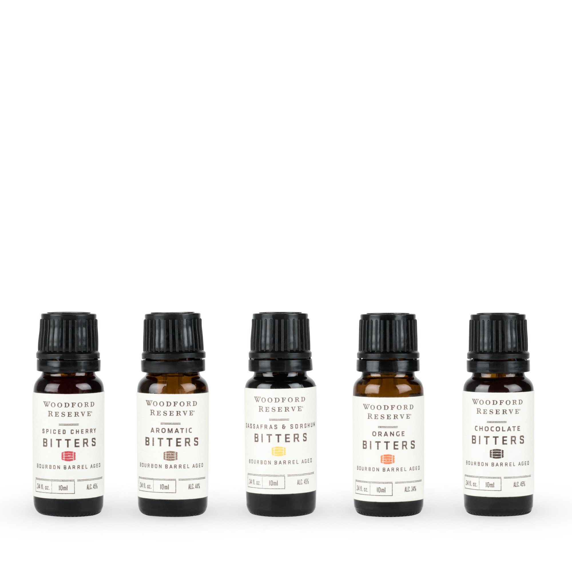 Collect all five outstanding Woodford Reserve® Bitters flavors with this combination 10ml gift set. The set is a perfect introduction to all of the Woodford Reserve® Bitters flavors. Each big flavor is made in small batches and tested at the Woodford Reserve® distillery room. All five of the Woodford Reserve® Bitters are effortlessly handy and easy to use with the convenient drip dram topper. Make the perfect cocktails, baked goods, or even add a drop to a tall glass of seltzer water with these endlessly versatile flavors.