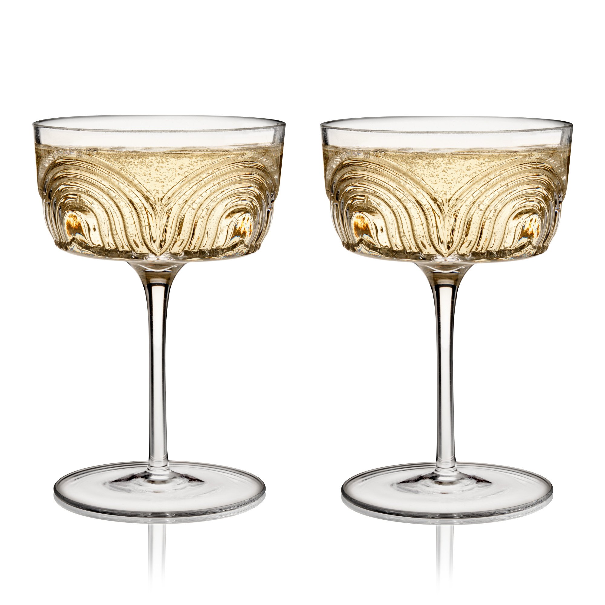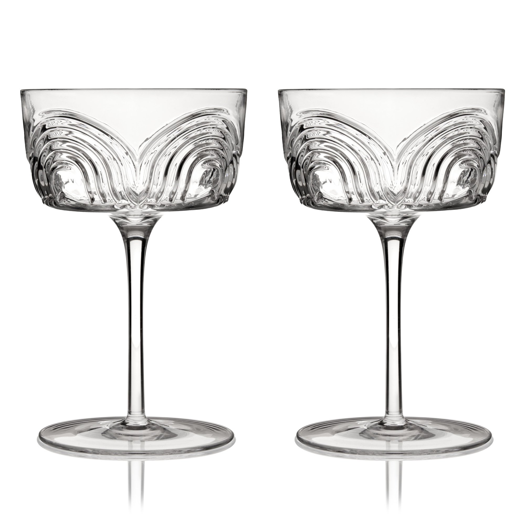 Featuring an angled bowl, classic stem, and sweeping textured arches, these crystal cocktail coupes are inspired by the era of Art Deco. Add some 1920s style to your Martinis, Champagne, or Manhattans with this cocktail glassware set. Dishwasher safe.