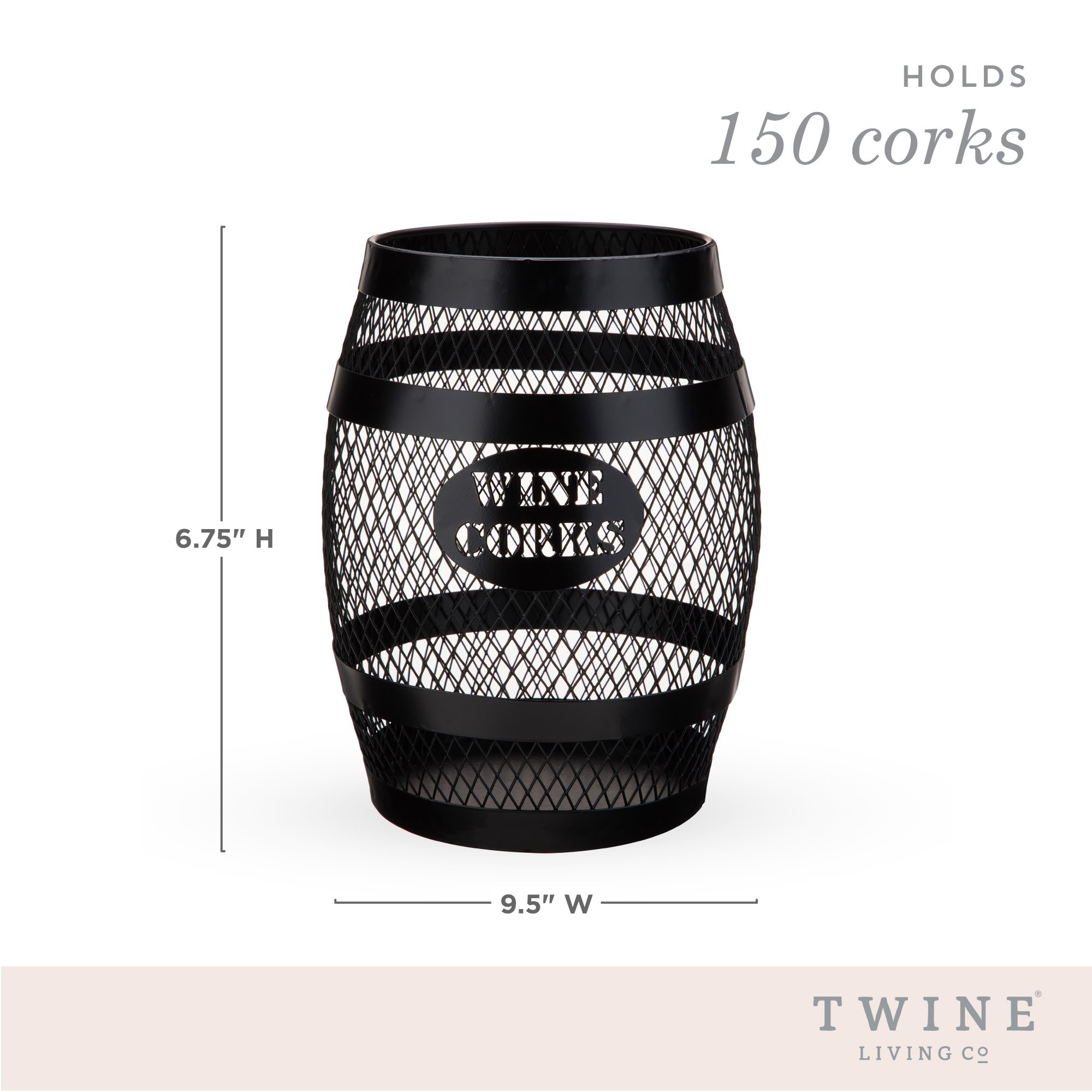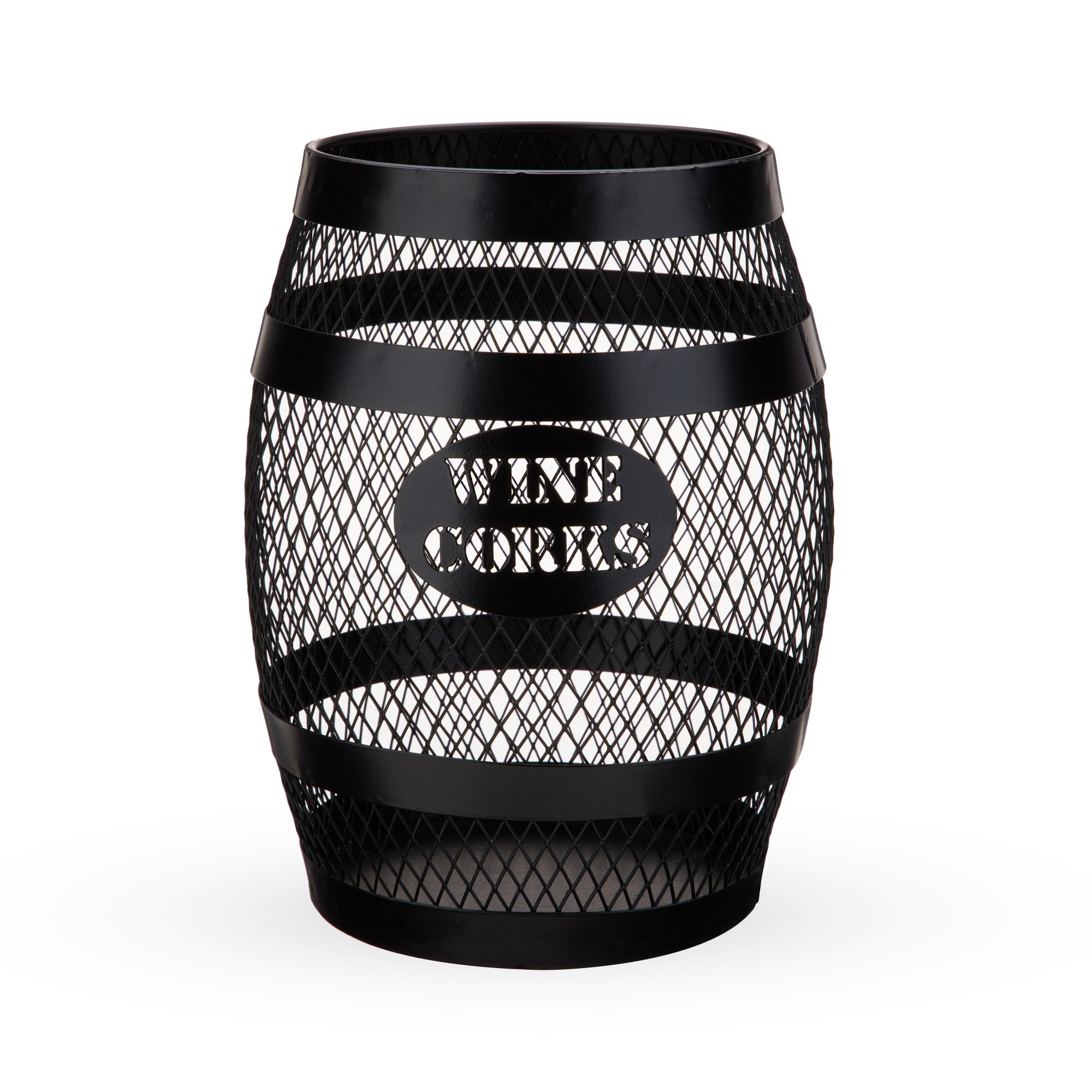 Form and function intertwine to create this metal cork holder. Its quaint wine barrel shape, sleek black finish, and clever label are all sure to charm. Holds up to 150 corks to satisfy even the heartiest wine lovers. Crafted from sturdy metal. Makes a great gift for design-conscious wine lovers. Holds 150 corks, measures 9.5" H x 6.75" W, cage design.