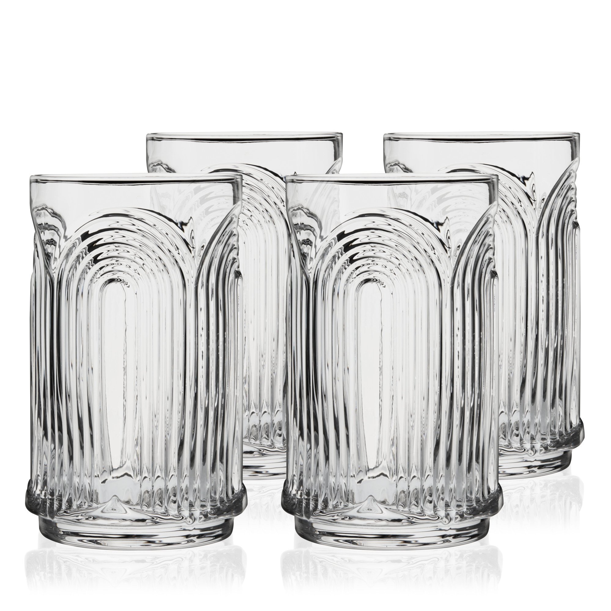 Repeating 3D arches pressed into glass make these vintage-style crystal highball glasses a unique way to serve cocktails or use as water glasses. Dishwasher safe and durable, they bring a retro touch to your glassware collection.
