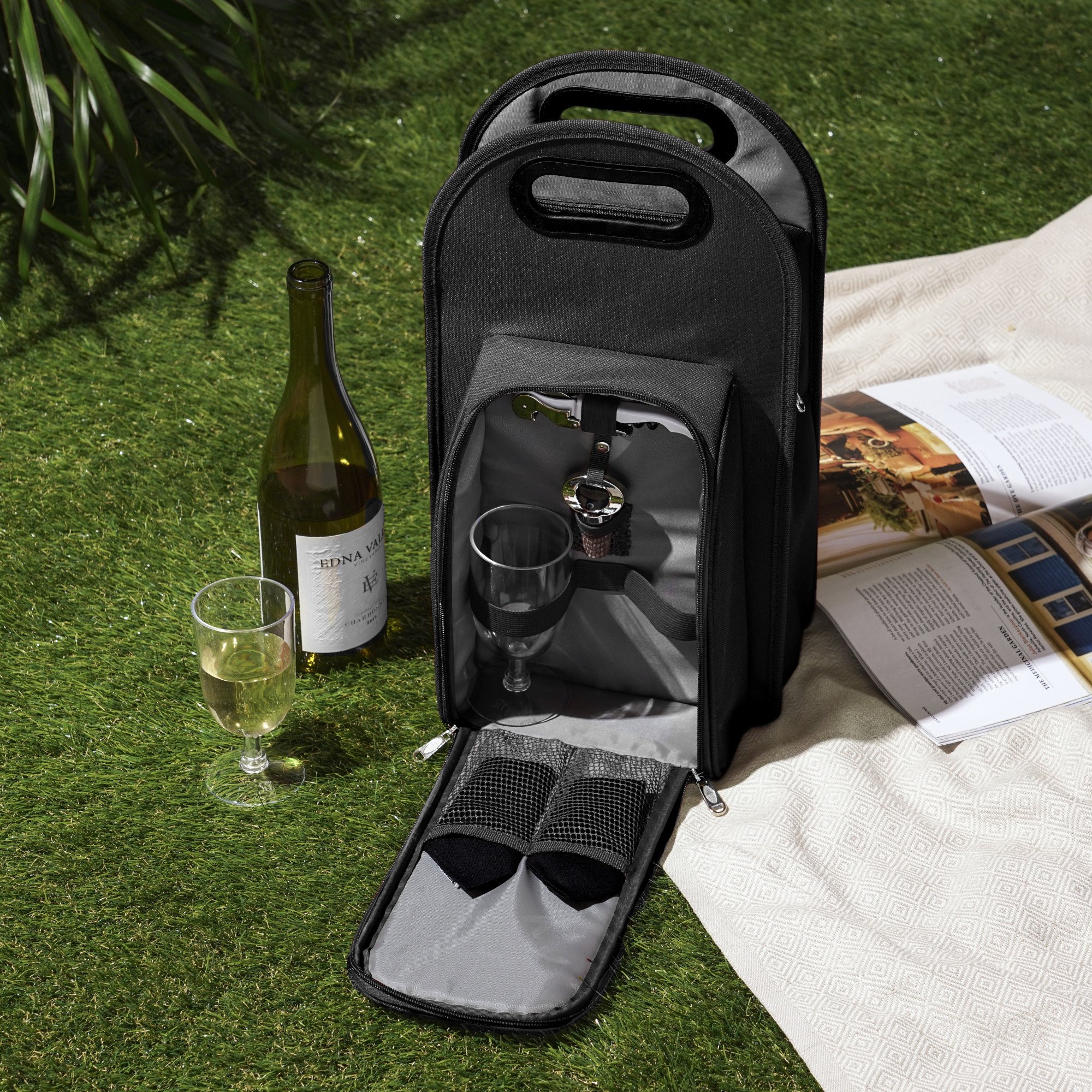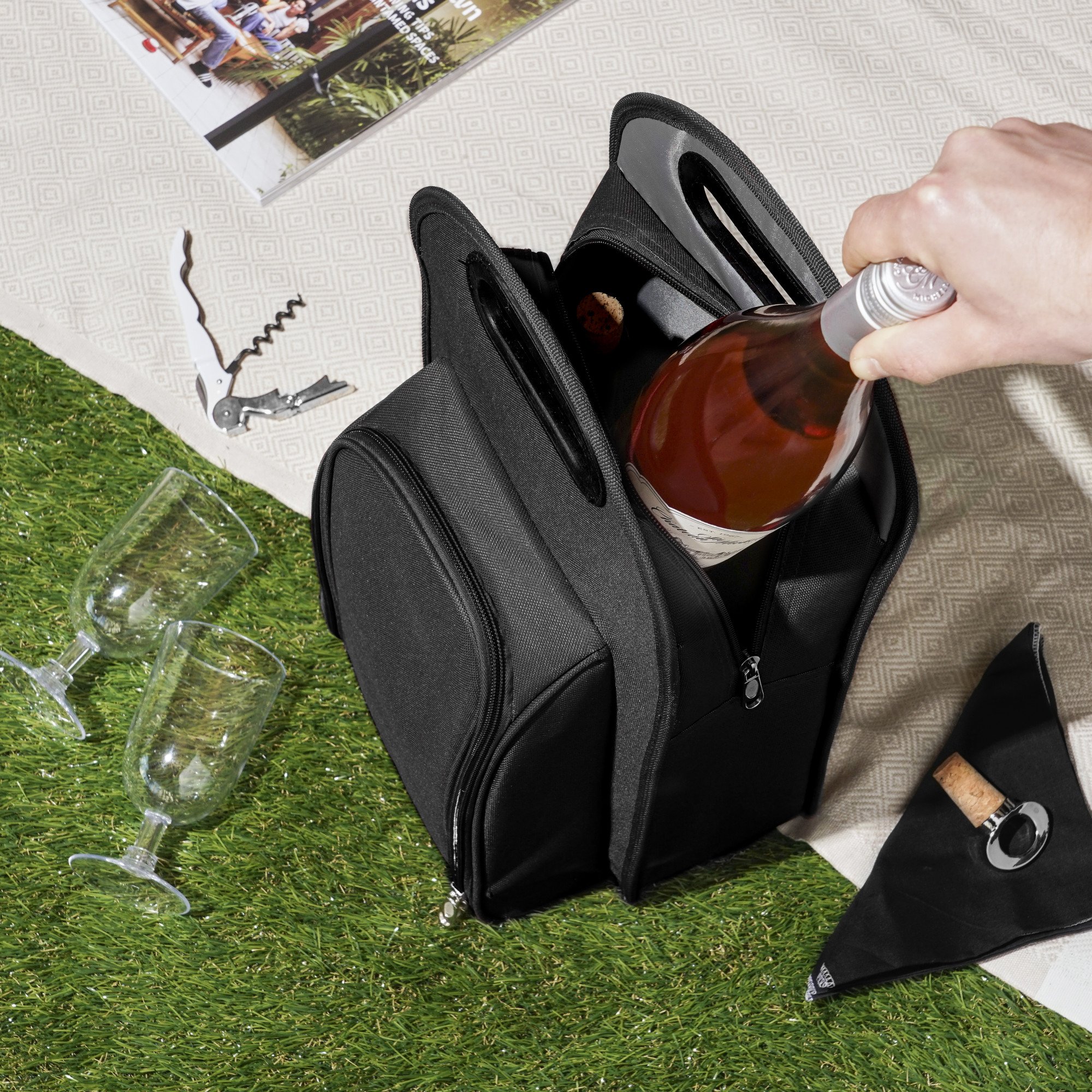 • INSULATED WINE TOTE - The insulated wine carrier’s pocket is perfect for stashing extra snacks and comes with 2 acrylic wine glasses, 2 napkins, a corkscrew, and a bottle stopper. The soft design makes this wine bag easy to store, unlike coolers.