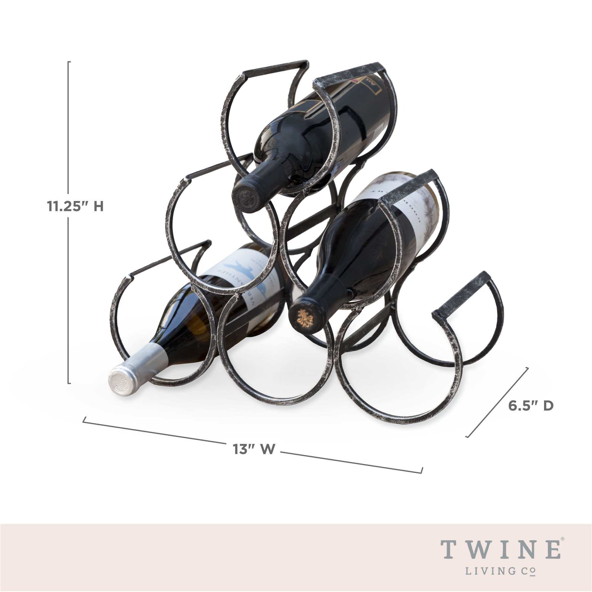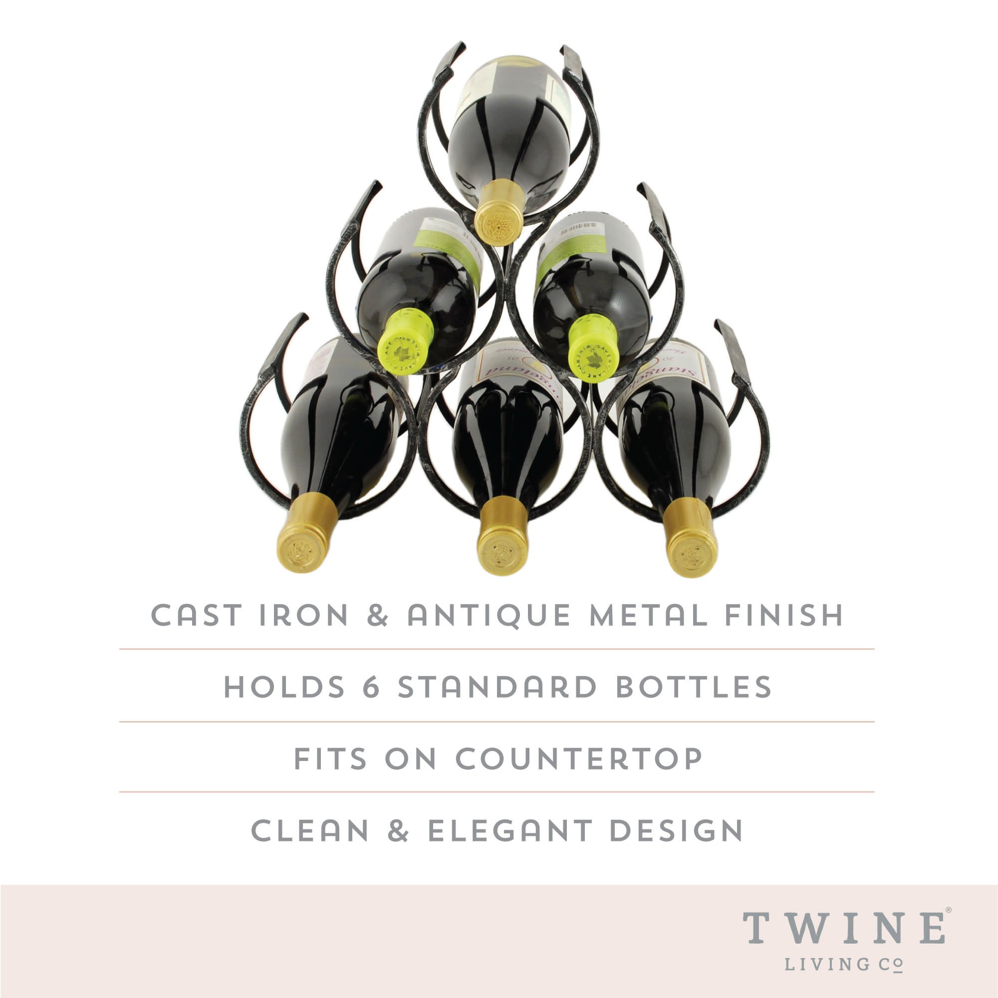 This sturdy cast iron wine rack will bring some country farmhouse style to your home bar or kitchen. Display and store your wine in this classic, elegant wine holder. Black cast iron with antiqued finish Holds 6 standard wine bottles 11.25" x 13" x 6.5" Classic vintage style This wine rack will transport you to a beautiful vineyard getaway in your own home. Twine’s collections emphasize rustic elegance, natural materials, and a nostalgic sense of quality. From elegant barware to quaint cheeseware, Twine ties everything together.