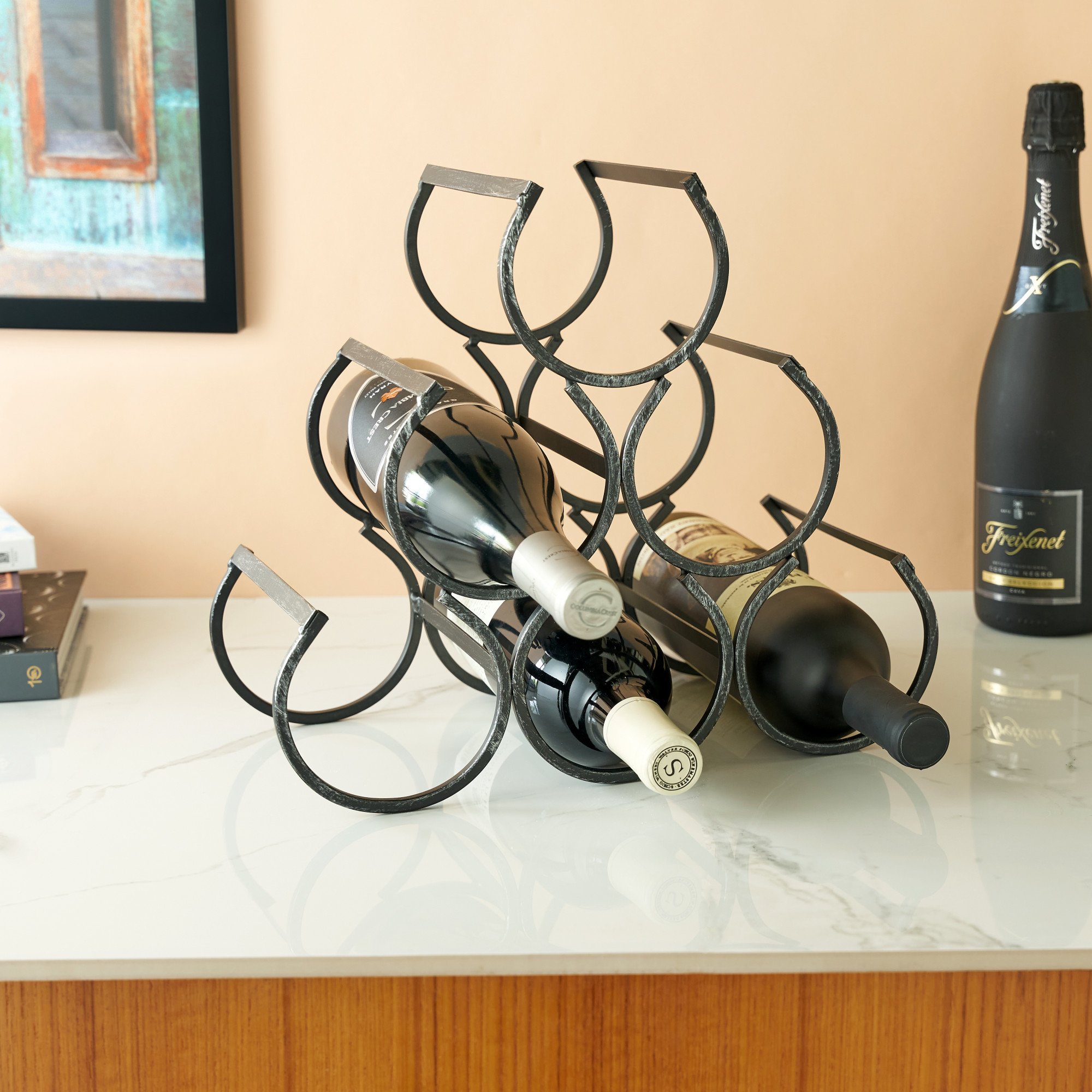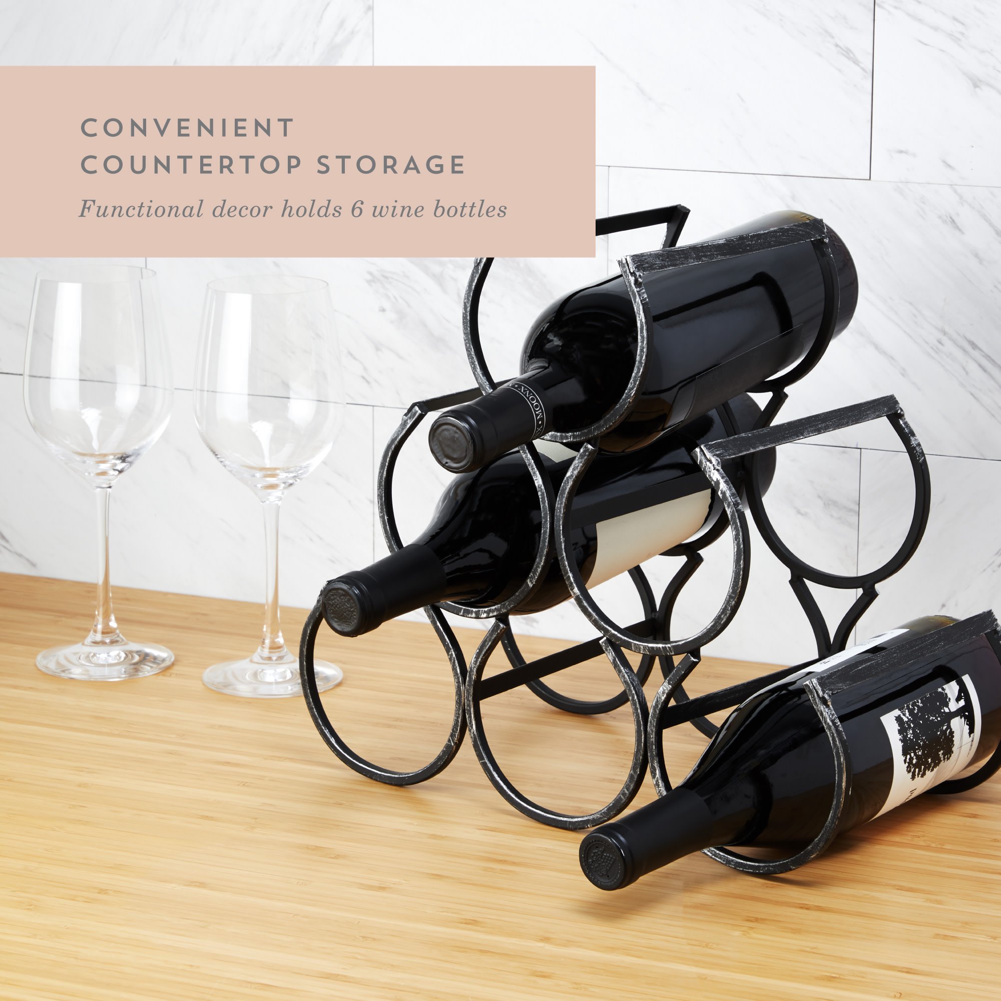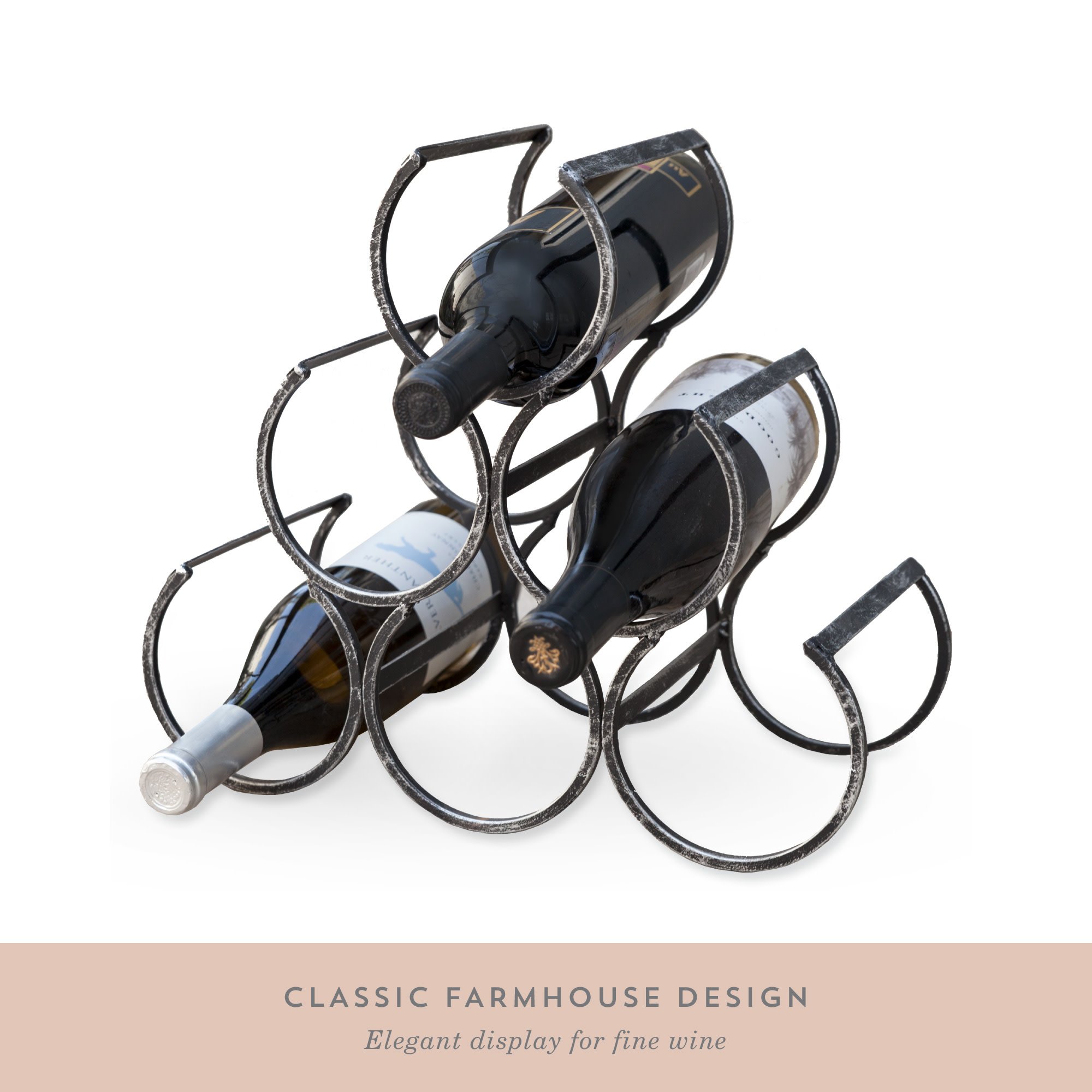 • ELEGANT TABLETOP WINE RACK - This antiqued wine bottle holder looks right at home in any rustic-styled kitchen, or on any metal bar cart. Airy, open frame creates space and light and lets you show off your wine bottles without being bulky.