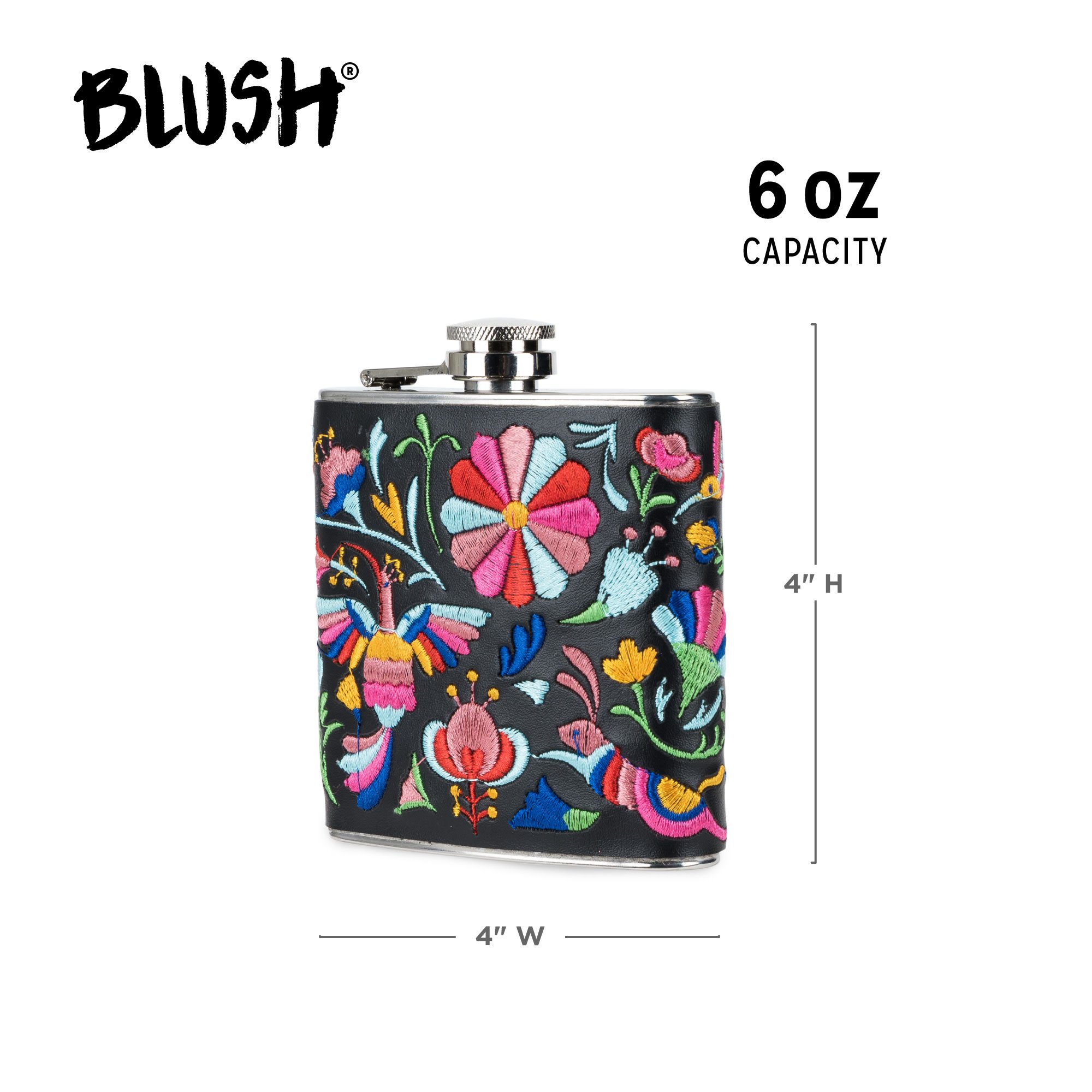 Introducing the Black Floral Embroidered Flask by Blush - the perfect addition to your wine accessories collection, crafted for women who appreciate style and functionality. The flask for women is a gorgeous blend of modern craftsmanship and traditional Mexican folk art design. This cute flask for women is not just about looks, it's also about convenience and practicality. The hip flask for liquor is compact and slim, making it easy to carry in your pocket or purse. It's a pocket flask that is perfect for on-the-go use. Whether you are heading to a party or a picnic, this flask ensures that your favorite beverage is always close at hand. Holding up to 6 oz of liquid, this flask for liquor is perfect for savoring your favorite whiskey or other beverages. Crafted from stainless steel, this leather flask is designed to stand the test of time. The black floral embroidery adds a touch of femininity and style, making it a whiskey flask that stands out. As a brand, Blush is known for its quality and attention to detail. This flask is no exception. It's a liquor flask that combines style, durability, and functionality.