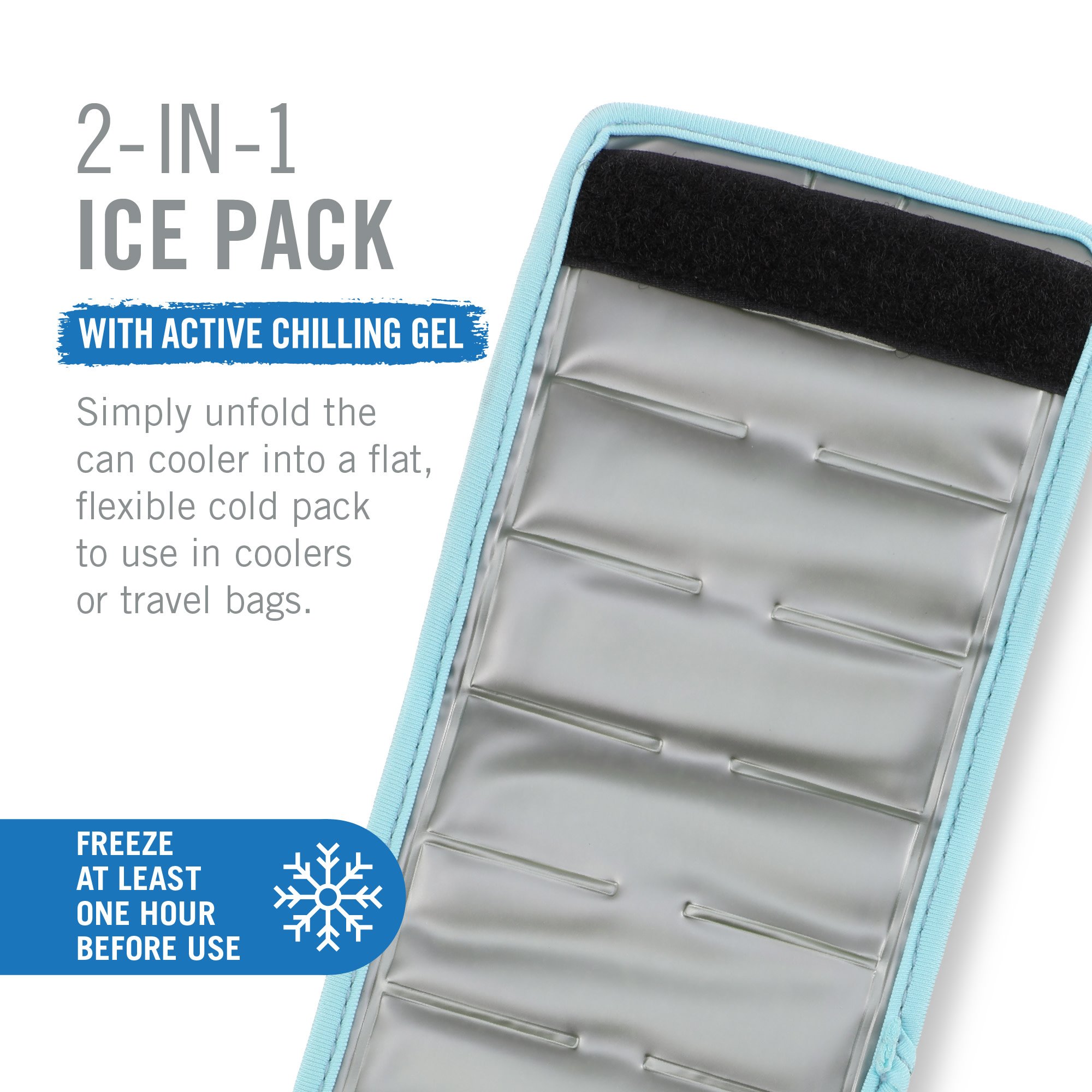 • 2-IN-1 ICE PACK - This can sleeve unfolds into a flat, flexible cold pack. Toss in your cooler to keep drinks cold in transit, then grab a can and wrap this sleeve around it with the velcro strip. It keeps your drinks cold in a cooler and in your hand.