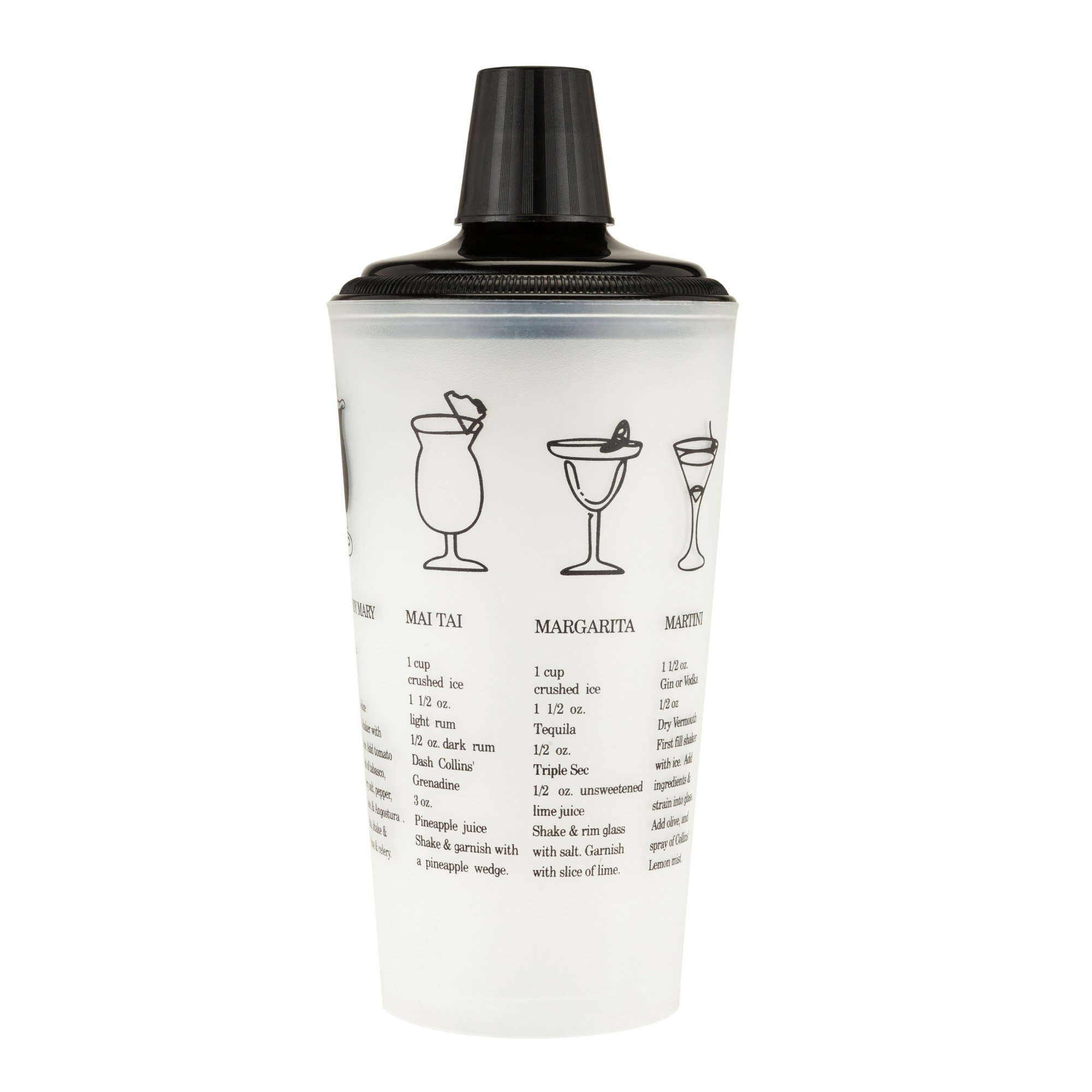 Make a splash at your next gathering with the Collins 20oz Black Cocktail Shaker, the perfect balance of form and function. This isn't your average cocktail shaker - it's a fun cocktail shaker, a cute cocktail shaker, and above all, a practical cocktail shaker! Made from durable, clear plastic, it's designed to withstand even the most raucous of parties, while its large size allows you to mix up multiple drinks at once. The shaker comes with a jigger cap and a strainer lid, so you can shake, mix, and serve without needing any other bar accessories. The clear cocktail shaker allows you to see exactly what's being mixed, while the printed measurements help you get proportions just right. From a Pineapple Daiquiri to a Whiskey Sour, you'll have the perfect mix every time. But the real star of the show is the recipes printed right on the side. This recipe shaker takes the guesswork out of cocktail making, letting you whip up classics like Pina Colada, Bloody Mary, Mai Tai, and Margarita with ease. And once you've mastered those, why not experiment and create your own signature cocktails? With this cocktail shaker with recipes, the possibilities are endless.